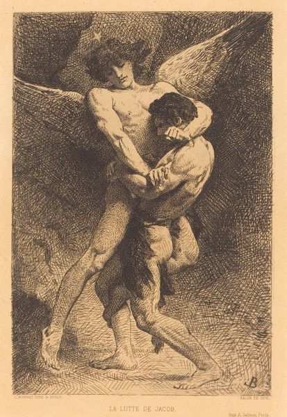 Curator: Muller's "The Rape of a Sabine Woman Seen from the Back, Her Face Visible" is quite a dramatic image. Editor: Indeed. The muscularity is so emphasized—it almost feels grotesque, overwhelming the subject matter itself. Curator: Consider how the artist uses the female figure as a compositional pivot, her averted face drawing the viewer’s eye. The Harvard Art Museums houses this striking print, and its existence speaks to the enduring fascination with classical narratives throughout history. Editor: I'm struck by the density of the lines. The engraving technique certainly heightens the sense of struggle and barely contained chaos. Curator: The historical context—the construction of Roman identity—is inextricably linked to acts of violence and appropriation. Editor: I see it. The work invites a powerful, if unsettling, formal analysis of force and vulnerability. Curator: The print serves as a stark reminder of how power dynamics have been visually encoded and perpetuated. Editor: It's clear that the work's unsettling aesthetic elements serve to mirror the violent subject matter.