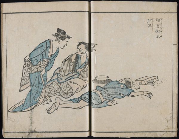 Curator: Here we have a double-page spread from Hokusai's "Manga," a collection of drawings now housed in the Guimet Museum in Paris. Though undated, it offers a fascinating glimpse into early 19th-century Japanese life. Editor: What immediately strikes me is the energy of the figures. They are wrestlers, rendered with minimal lines, yet each posture conveys such dynamic force. The sumo figures, especially, feel robust and very much alive! Curator: Hokusai, best known for his woodblock prints, particularly "The Great Wave," used ink on paper for these drawings. It is really fascinating how he uses genre-painting to show social aspects in Japan. "Manga" is not, of course, manga as we understand it today; it translates more accurately as "sketches from life" or "random drawings." Editor: That makes sense given the subjects portrayed. They're caught in such immediate, active moments. We see not only physical exertion in their sparring, but I perceive elements of humor too. Hokusai captured something essential about human action and interaction in that very direct imagery. Even today they speak about Japan. Curator: It is interesting you pointed out humor. One of the goals Hokusai pursued through "Manga" was a method to teach his apprentices. He shows through visual means how to depict complex scenes of ordinary life using few strokes and basic forms. This was meant to facilitate replication for mass consumption. Editor: And did the imagery and visual symbolism became cultural reference points later on? The flowing garments, the posture of respect, the expressions... There seems a common unspoken visual grammar within all the figures represented here. I mean, even if we had no other knowledge than this single page, it delivers cultural data! Curator: Absolutely! The "Manga," while not intentionally political, circulated among the public and inevitably impacted socio-cultural trends and aesthetic tastes. Editor: Thinking about those visual shorthands, perhaps we are looking at the genesis of modern manga here, regardless of what the intention behind its production was. Curator: Maybe so! Regardless of its future reception, the work encapsulates the spirit of its era—a dynamic mix of observation, artistry, and mass media production in Japan! Editor: Indeed. This artwork leaves me wondering about all the lives—the artist, the characters in his pages, and all the future people impacted by it... all those figures, captured by a gifted mind, and fixed forever on paper.