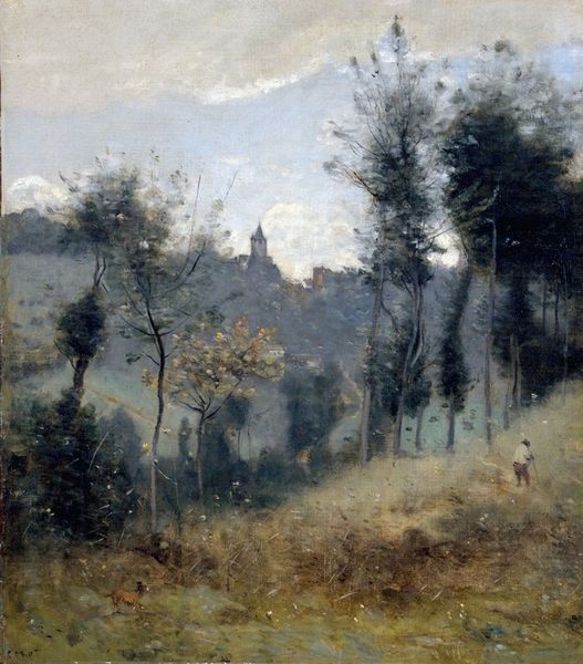 Editor: So, here we have "The Dance of the Nymphs," painted between 1865 and 1870 by Camille Corot, using oil paint. It’s got this hazy, almost dreamlike quality. It’s romantic. What grabs you when you look at it? Curator: What grabs me? Oh, where do I even begin with Corot? His landscapes aren’t just places, are they? They're feelings made visible, poems whispered in paint. It’s like he took a memory, frayed around the edges, softened by time, and splashed it onto the canvas. Do you feel the figures are an integral part of the painting? Editor: They're small, almost lost in the landscape. I guess I see them as part of it? Curator: Exactly! That blurring of the line between humanity and nature is very romantic, isn't it? These aren’t specific nymphs, identifiable figures. They’re echoes of joy, fleeting glimpses of beauty. For me, it’s almost an ode to the elusiveness of happiness itself. He gives us that hazy background and then contrasts that with a brighter area where you can more clearly make out figures. What do you think that does for the feel of the painting? Editor: It makes the nymphs stand out just a little more. It also creates a contrast, with the more brightly colored area pushing toward the viewer, heightening the depth effect and creating a focal point that guides you across the landscape to the horizon. Curator: Beautifully observed! It's almost as if Corot is inviting us to play hide-and-seek with beauty itself, or at least contemplate how wonderful it can be to just see it even for a moment. It has got me wondering about a dance in the fields, I feel a compulsion to join the fun, how about you? Editor: Definitely makes you want to escape into that landscape. Thanks for highlighting so many wonderful aspects of it!