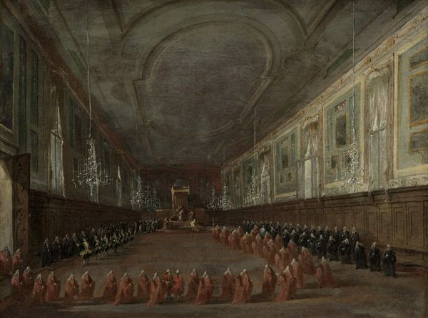 Editor: So, we’re looking at "Audience Granted by the Doge" painted around 1770 by Francesco Guardi, currently housed in the Louvre. It’s an oil painting depicting a formal gathering, and what strikes me first is the sheer scale and depth. It almost feels like you're peering into a stage set. What draws your eye when you look at it? Curator: It's interesting you say "stage set," because Guardi masterfully manipulates perspective here to heighten that sense of drama and grandeur. It’s not just a record of an event; it's a constructed vision of power. I almost feel like I'm there, watching the Doge holding court. But it's more than a visual experience. What feelings arise when you observe this gathering of people in the Doge’s presence? Editor: A kind of... hushed anticipation? There’s a stillness despite the crowd, like everyone is holding their breath. And the architecture looms so large, it dwarfs the figures. Curator: Exactly! The architecture becomes a character in itself, doesn't it? The Rococo style—all that ornate detail—isn’t just decorative. It’s reinforcing the Doge’s authority. But look closely at Guardi's brushstrokes. Are they as precise as, say, Canaletto’s? Editor: Not at all! They're much looser, almost impressionistic. It’s less about photographic accuracy and more about capturing a fleeting moment, an impression of the event. Curator: Yes! Guardi sacrifices some detail for a more vibrant, atmospheric effect. He wants to convey the spectacle, the buzz, the *feeling* of that moment in time, rather than documenting every last button and bauble. That painterly style makes it a truly modern piece, in a way, don’t you think? Editor: I do now! It’s less about the specific event and more about the atmosphere and emotion it evokes. I came in thinking it was a formal record, but now it seems like Guardi was playing with capturing something more profound, more fleeting. Curator: Precisely! And perhaps even hinting at the fleeting nature of power itself. Makes you think, doesn't it?