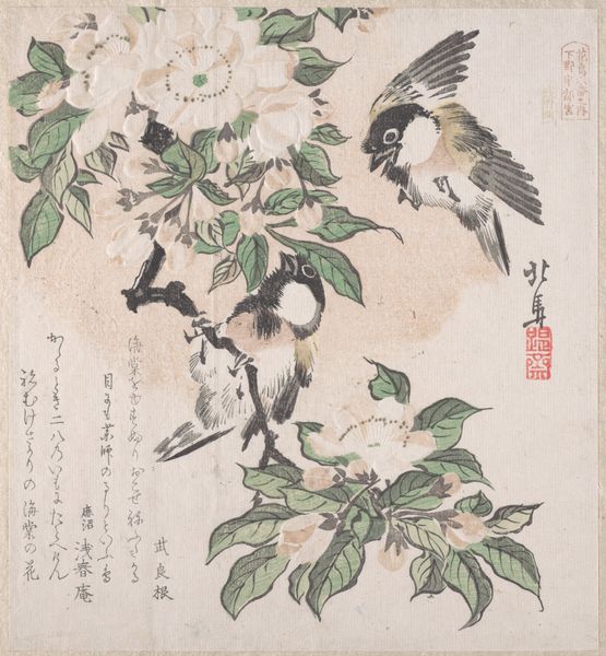 Curator: Welcome. Today, we’re looking at a watercolor and ink painting on paper titled "(Sparrow on a wisteria branch)" by Kōno Bairei, created sometime between 1859 and 1895. It’s part of the collection at the Minneapolis Institute of Art. Editor: My first impression is one of lightness. There’s an almost fragile quality to the rendering, especially the soft gradation of colors. Curator: Absolutely. Bairei’s control over the medium is evident in the delicate brushwork and how he captures light. Note the precise use of line to define the forms of the sparrow and the wisteria. How do these formal elements structure our perception? Editor: For me, the composition evokes themes of nature, beauty, and the ephemeral. Consider wisteria's significance in Japanese art, symbolizing humility and love, often adorning homes. The sparrow, so common yet vividly present, reminds me of resilience and the beauty found in the everyday. It’s interesting how it invites a deeper connection to our surroundings. Curator: Precisely! The artist masterfully orchestrates color. The vibrant purples and greens of the wisteria contrast subtly with the sparrow’s earth tones. And the unpainted ground is crucial: the use of negative space around the composition emphasizes the key components within the scene. Editor: I agree. But also it makes me think about how this piece reflects the complex relationship between nature and human culture. The act of capturing this scene – the selection, the arrangement, and the skillful rendering of the subject—all speak to our desire to engage with the natural world, which in itself can lead to conversations about conservation and our impact. Curator: Indeed, the seemingly simple composition of the work, a few carefully placed elements, belies the underlying skill needed to convey such nuance. Bairei understood the poetics of subtraction. Editor: As a whole, the image resonates as more than just a depiction of a bird on a flower. It's a cultural artifact, reflecting specific aesthetic and philosophical values embedded within the time it was created, but the simplicity continues to speak volumes today. Curator: And that skillful visual language makes the painting something so special, even after all this time. Editor: An open window for historical interpretation that offers much room for contemporary questions to bloom, yes.