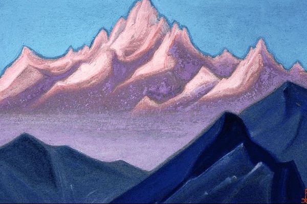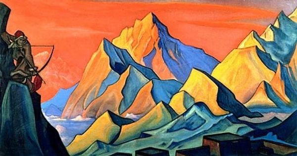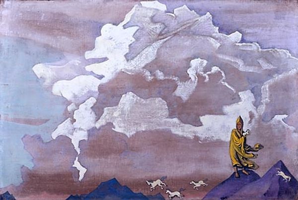 Nicholas Roerich painted this work, Snow Maiden, with tempera, an ancient medium binding pigment with egg yolk, evoking a mystical and timeless atmosphere. Dominating the image is the archetypal figure of a maiden, poised on the edge of a vast landscape beneath towering mountains, emblems of permanence and spiritual aspiration across cultures. Consider the maiden, a symbol resonating with figures like the Greek nymph or the Slavic Rusalka. These figures represent the untamed, often melancholic spirit of nature. The maiden’s presence links to the ‘anima’ in Jungian psychology, the feminine aspect of the male psyche, suggesting an exploration of inner emotional landscapes. The compositional element of the figure in relation to the landscape echoes the Romantic tradition, where the individual confronts the sublime power of nature. This trope, seen in works from Caspar David Friedrich, positions the viewer in a similar emotional space—a space of awe, solitude, and a deep connection to the natural world. It’s a visual echo rippling through time, modified yet familiar, revealing the persistence of certain visual and emotional motifs across epochs.