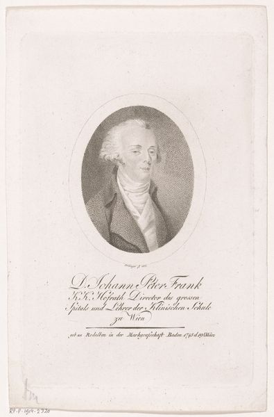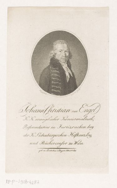 Editor: We're looking at "Portret van Lebrecht Friedrich Benjamin Lentin," an engraving from between 1780 and 1832, by Johann Daniel Laurenz. It's a striking image, very formal. What are your thoughts on its composition? Curator: The most immediately striking element is the portrait’s geometric severity. Note the stark contrast between the meticulously rendered texture of the subject’s coat, achieved through precise hatching, and the smooth, almost porcelain-like finish of the face. Do you perceive a tension there? Editor: Yes, it's like two separate realities coexisting. It's interesting you focus on the materials. Can you say more? Curator: Observe the oval frame; it serves to isolate and elevate the subject. The formal device forces us to contemplate the very essence of portraiture—the interplay of light, shadow, and form used to capture the sitter's likeness. Consider how the tight, controlled lines communicate a sense of restrained power, characteristic of Neoclassical ideals. Do you find evidence of those ideals here? Editor: Yes, the overall order feels neoclassical, now that you point it out. I was distracted by the details initially. Curator: Precisely. And distraction is a potent tool! Reflect upon how the artist utilizes techniques of line and form to elicit such an immediate reaction. Consider, as well, the space below the portrait: occupied by carefully inscribed text—all contributing to the engraving’s complex visual architecture. Editor: I hadn't thought of the lettering as part of the visual architecture. It makes me consider it as a piece with different, deliberate parts. Curator: Indeed. The material processes are the message and reveal insight that other interpretations may obfuscate. I trust you’ve found this elucidating.