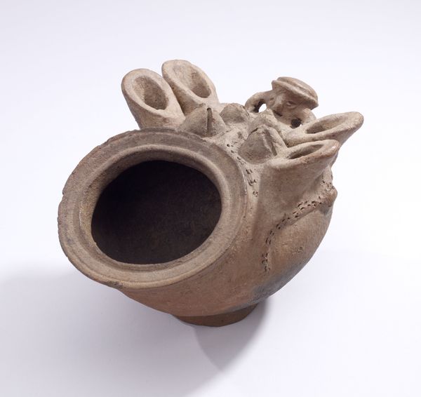 This terracotta bowl was made by an artist from the Tiv people, sometime in the past. It's got this wonderful, earthy tone, the kind that reminds you where things come from. The bowl itself is this almost-perfect sphere, but then there's this figure perched on top, like it's guarding the opening. The clay has been worked so directly. You can almost feel the hand that shaped it, not just in the form, but in the incised lines that detail the figure. Look closely at the small marks around the rim, they seem almost gestural. You get a sense of the artist figuring things out as they went, a real conversation with the material. It makes me think of Magdelena Suarez Frimkess's playful ceramics. There's a similar freedom and joy in the making. Art isn't just about answers, it's about the questions we ask along the way.