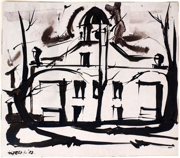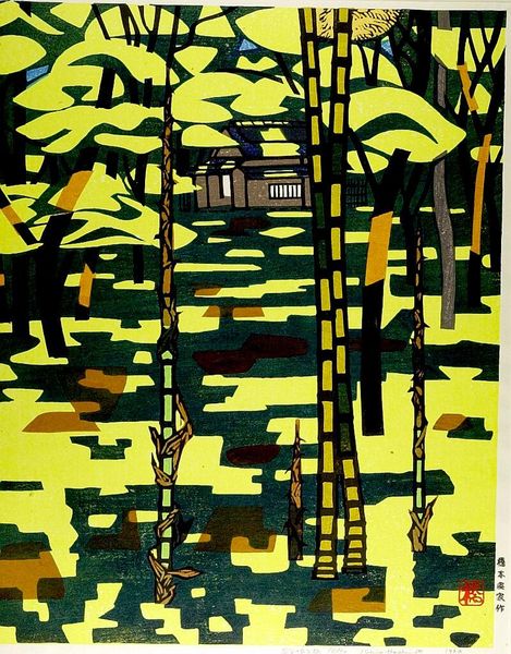 Vytautas Kasiulis created "The Pink Cottage" using printmaking techniques. The composition is dominated by a small cottage, seemingly afloat in an atmospheric field of yellows and greens, contained by a gestural perimeter of greens and blacks. The overall effect is both serene and somewhat unsettling, a duality typical of Kasiulis's style. Kasiulis's works often explore the semiotic relationship between form and space, and this print is no exception. The cottage, rendered in delicate pink hues, sits as a signifier of domesticity, yet its isolation destabilizes this conventional meaning. The rough, almost chaotic texture of the surrounding landscape, achieved through layered inks, challenges our perception of the familiar, suggesting a world where the boundary between inside and outside, safety and wilderness, is blurred. Note how the formal qualities—the contrasting textures and colors—invite a dialogue about the constructed nature of our surroundings and the instability of fixed meanings. This print is not merely a representation of a cottage; it is an invitation to reconsider our relationship with the spaces we inhabit and the stories they tell.