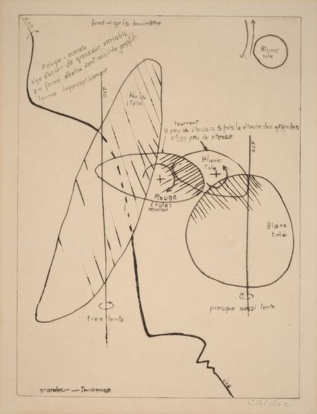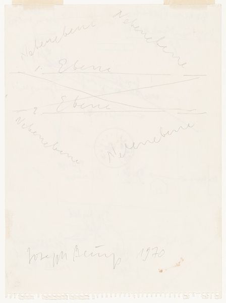 Editor: This is "Untitled," a 1970 graphite drawing by Joseph Beuys. At first glance, it resembles a mind map, full of cryptic symbols and German words. How do you interpret this work? Curator: The cultural weight here is immense, isn't it? Look at the combination of geometric forms and hand-written text, how they attempt to represent abstract ideas. It reminds me of alchemical diagrams or perhaps even Rosicrucian symbolism, mapping out a kind of internal, spiritual process. Editor: Yes, it's intriguing! What about the house-like shape and the cross within the circle? What do they signify? Curator: The house, labeled "Material," is almost archetypal, referencing shelter, the body, the earth. Juxtapose that with the cross within a circle. Consider that symbol's history: redemption, sacrifice, or unity. By placing that potent image at the drawing's center, Beuys asks us to meditate on humanity’s place between the material and the spiritual realms. It is less about direct translation, and more about opening associations. Editor: It makes sense, especially in relation to other text notations – "feeling", "soul", "stillness". The artist encourages active reflection on what connects these concepts. I notice the arrows, constantly connecting seemingly disconnected symbols, unifying them into a larger concept. Curator: Precisely. The lines direct our cognitive processes, suggesting links. It also seems inherently unfinished, like an invitation for us to actively add our own interpretations, weaving the narrative that fits our individual experiences. That's a cultural act in itself: recognizing the shared and the personal. Editor: Thank you. I never thought about how personal associations become integral to this type of artwork. Curator: Indeed. These works highlight how symbolism transcends historical context to reflect something eternally, intrinsically human.