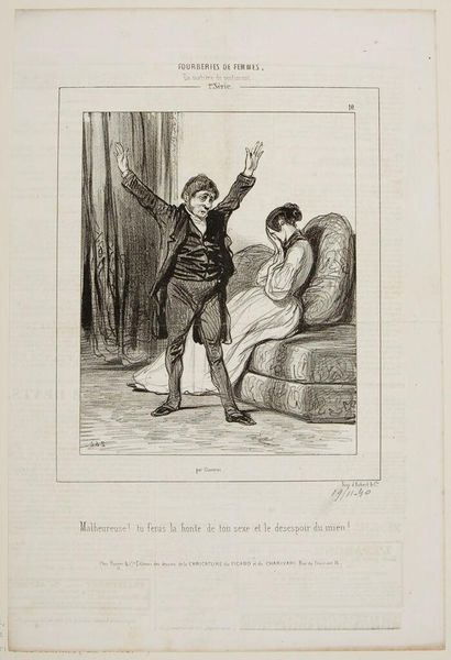 Editor: So, this print is called "But if a man had been for me . . .," by Paul Gavarni. The lines are so expressive, almost frantic. I’m curious, what’s your interpretation of the scene? Curator: Well, the exaggerated gestures speak volumes, don’t they? Look at the man’s pleading hands, the woman’s stoic pose. Perhaps Gavarni is poking fun at romantic disillusionment or gendered expectations of the time. What do you think the text beneath the image hints at? Editor: It looks like the woman is saying she would be ashamed if someone had done to a man what he has done to her. A bit of a double standard? Curator: Precisely! Gavarni captures that societal hypocrisy with a touch of wit. It makes you wonder what the specifics of the situation were. Editor: I guess looking closer reveals the cultural context, and the artist’s playful critique. Curator: Exactly. Art, like life, is always richer with a little context, a sprinkle of curiosity.