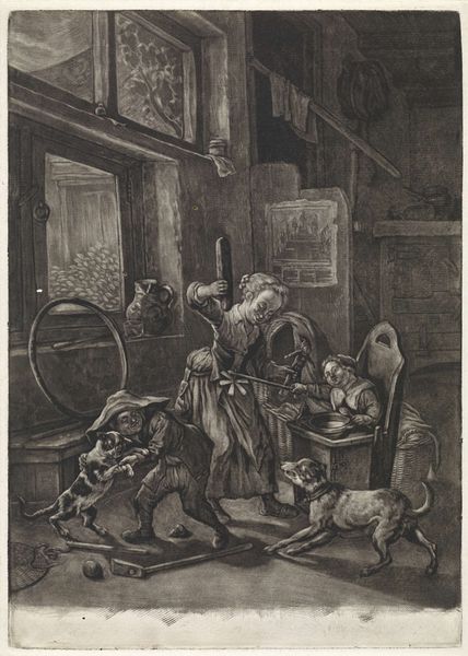 Curator: This print, likely dating between 1655 and 1700, is titled "Herberg met drinkende mannen" and attributed to Jan van Somer. The scene unfolds in what appears to be a Dutch tavern. The medium is print, the method line, a process that necessarily demanded meticulous labor from the printmaker to depict depth, detail and texture. Editor: It smells like stale beer and tobacco. All those heavy lines sort of trapping the light… gives you a sense of how smoky and close the air would have been. Everyone crammed together—a whole other world humming along inside this wooden box. Curator: Note the compositional strategies deployed to engage the viewer. The artist uses the interplay of light and shadow to direct the eye across the image, emphasizing social hierarchies within this tavern scene, from those actively drinking and gambling to those relegated to the margins. What do you make of these different social spaces being articulated? Editor: It feels like the top of a bell jar or maybe the pit after the show. Like the quiet dude sleeping it off by the fire or the eavesdropper listening from the stairs – all part of the same play. Is it too romantic to read that yearning into all that chiaroscuro, yearning for something maybe unattainable? Curator: Jan van Somer worked within a complex ecosystem of print production, relying on collaboration and networks of patronage to distribute these images. Consumption habits played an important role. Prints were collected, exchanged, displayed. Think about the economic implications. Genre scenes of everyday life like this contributed to an expanding marketplace for art accessible to the burgeoning middle class. Editor: It's amazing, that an object made from metal can be felt as such living matter. And, yeah, a tangible slice of daily bread for these figures trapped here... cheers! Curator: Exactly. Prints such as these provide a glimpse into not only Dutch Golden Age visual culture but also underscore how images mediated social identities and experiences. Editor: I am really taken by the feeling. Thank you.