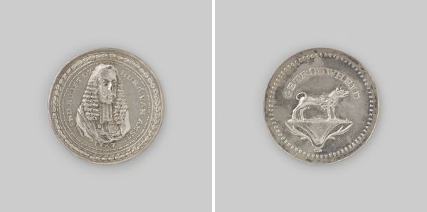 This diminutive silver medal, of unknown date and authorship, presents a compelling study in miniature form. At just 1.8 centimeters in diameter, its scale demands close inspection. One side features a bust of Joan Derk van der Capellen tot den Pol, encircled by text and a laurel wreath, rendered with a striking contrast of light and shadow achieved through relief. Turn the medal over, and you'll observe a dog atop a pedestal, similarly framed by text. The composition on both sides is tightly contained, emphasizing the circular format and drawing the eye to the central figures. This medal destabilizes conventional notions of monumentality. While traditional portraiture often uses scale to assert power, here, the medal's intimacy suggests a more personal, perhaps even subversive, form of commemoration. The circular shape, unbroken, hints at cyclical patterns of memory and history. Ultimately, the medal challenges the viewer to reconsider how value and significance are constructed.