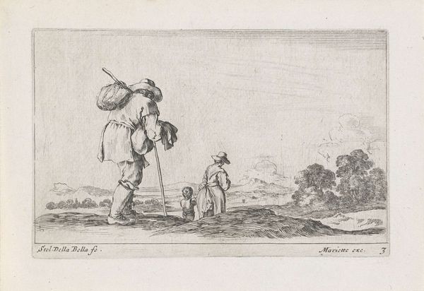 Editor: This is "The Merchant of Poultry and Game," an undated print by Jean-Baptiste Le Prince. The merchant seems weighed down, yet the background shows people enjoying leisure. What social commentary might Le Prince be making here? Curator: It's fascinating how Le Prince contrasts the merchant's labor with the leisure of others. Consider the context: prints like these circulated widely, shaping perceptions of different social classes. How might this image reinforce or challenge existing social hierarchies? Editor: So, the print isn't just a depiction, but an active participant in shaping social views? Curator: Precisely. The image invites viewers to consider the realities of labor and leisure within 18th-century society, possibly prompting reflection on the fairness of social divisions. Editor: That's given me a whole new perspective on the piece! Curator: It’s amazing how art reflects—and shapes—society.