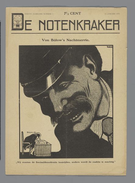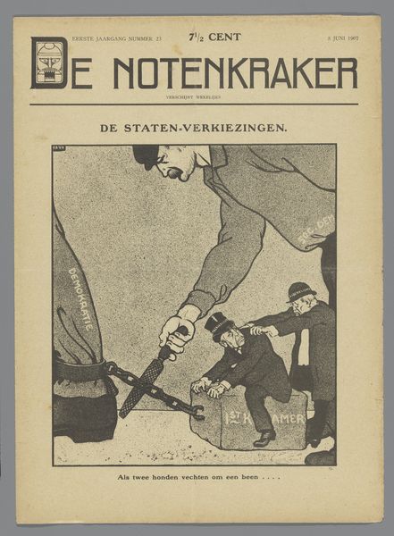 Curator: This is a page from "De Notenkraker," a Dutch satirical magazine, dated September 14, 1907. The image, titled "Kiesrecht en sociale hervormingen," translates to "Suffrage and Social Reform." It's likely a pen drawing reproduced as a print, and its artist is Albert Hahn. Editor: It immediately strikes me as a portrait of helplessness, a man bound by thick chains, juxtaposed with this weighty, almost monumental load labeled "Social Reform". The tonal range creates an unsettling and urgent mood. Curator: Hahn frequently employed symbolism to address the socio-political climate of the time. This particular piece critiques the slow pace of social reform. Notice the figure on the left? That is likely a political figure, minister De Meester who the chained worker is calling out to "make my strong arms free from the chains of the electoral law." Editor: Those chains really stand out. Chains historically represent captivity and restriction, which fits the imagery. But the weight is literal as well: chained, he cannot bring forth that much-needed social reform, visualized as the large parcels being pulled behind him. It’s also a striking metaphor for disenfranchisement, doesn't have access to tools to help himself or others. Curator: Precisely! Consider the broader context: This was a period of growing labor movements and demands for universal suffrage in the Netherlands. The artwork becomes a poignant commentary on how political stagnation hinders progress. And if social reform doesn't progress there may be unrest. Editor: Thinking about it, the scale amplifies the message. The disproportionate size of the chained man emphasizes a kind of enforced immobility and dependence. You can almost feel the worker's helplessness at having the chains wrapped around his arms. He is waiting, bound, dependent. Curator: Indeed. This image offers us a historical snapshot but also serves as a powerful reminder of the ongoing struggle for equality and social justice. Hahn's ability to connect individual struggles with broader societal themes makes it a lasting social statement. Editor: Definitely. The clarity of the symbols and the starkness of the imagery help to create lasting and resonant commentary on these societal and political forces and figures.