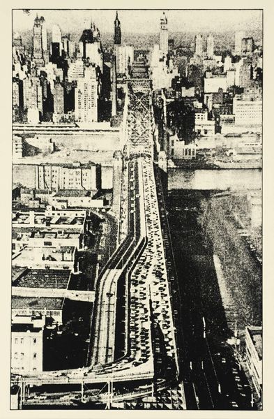 Curator: I find myself immediately drawn to the imposing scale and dynamic angles captured in this print. There’s almost a sense of precarity. Editor: And it should! We're looking at Otis Oldfield's "Bay Bridge Anchorage," created around 1936. Oldfield’s work often highlighted scenes of labor and industry within the rapidly changing urban landscapes of California during the Depression era. This one presents us with the construction of the Bay Bridge as it impacted working class neighborhoods nearby. Curator: So the bridge functions as a symbol of progress, but one that quite literally overshadows these modest homes. I see those discarded cars as a suggestion of lost or fading personal histories in the wake of economic change. Editor: The image of the bridge itself resonates, I think, with the symbolic history of bridges in general: connections, transitions, and passages. Bridges in art and culture represent the joining of disparate worlds. This feels transitional and temporal. What’s being built, and what’s being left behind? Curator: Indeed. Notice the use of pencil—a very accessible medium— to depict this grand feat of engineering alongside those decaying cars. Oldfield almost creates a visual class distinction. It raises questions about who truly benefits from such monumental endeavors and who bears the cost. Editor: Yes. Look too at how the texture and tone work with this idea of disruption. There's such detail given to the old, humble textures in the lower half. That sharp, almost painful contrast is quite telling. Curator: It's a potent reminder that progress often has deeply unequal and underreported effects on vulnerable communities. Oldfield, through the juxtaposition of grandeur and decay, asks us to critically examine what and whom we prioritize. Editor: An uncomfortable truth, expertly etched and laden with layered visual symbols! Now I’m seeing new aspects of this piece I hadn't noticed at first glance.