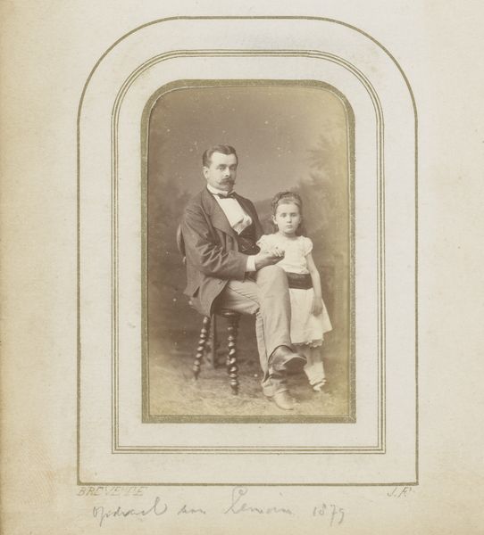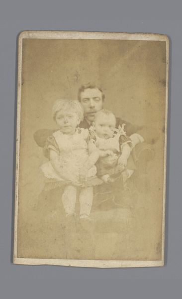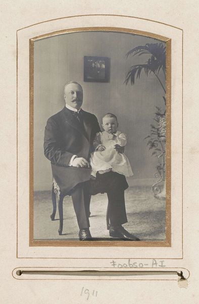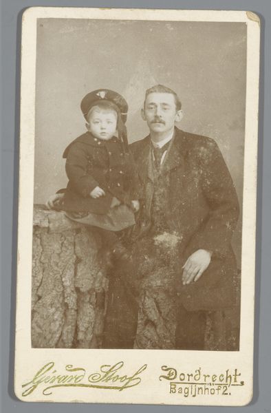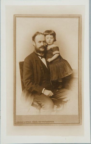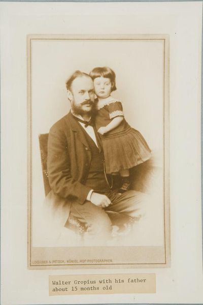 Curator: This photograph captures Walter Gropius at 15 months old with his father, taken by Loescher & Petsch. I find it striking how posed and formal it is. Editor: Yes, it's fascinating how the sepia tones create a timeless feeling, yet it also feels very stiff, even alienating. I wonder about the cultural conventions at play here. The child seems almost like an accessory. Curator: The seriousness in young Walter's eyes hints at the weight of familial expectation and the symbolic passing of lineage. What was the social and material function of such a portrait? Editor: Well, photography at this time was still a fairly involved process, suggesting a certain level of wealth and status, not just the labour of production but the consumption of the image itself. It was a deliberate act of self-representation. Curator: Precisely. And perhaps we can see the seeds of Gropius's later architectural focus on functionality and form, even in the child's severe gaze. Editor: Indeed, viewing it through that lens, one begins to see the photo itself as a constructed object, much like the buildings he would later design. I appreciate how this brings those concepts into focus.