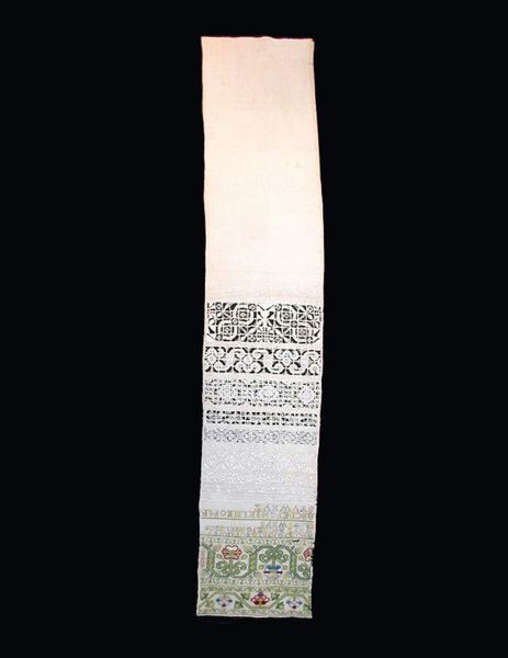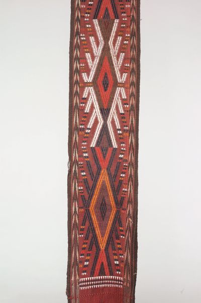 Curator: This object is a woman's belt, a faja, created sometime in the 20th century. It resides here at the Minneapolis Institute of Art and showcases weaving using cotton, wool and silk threads. Editor: Immediately striking is the belt’s emphatic verticality, the way the various visual registers stack one on top of the other to emphasize the overall elongated form, the interplay of positive and negative space— Curator: Think of the belt, though, not merely as design, but as something interwoven with personal and cultural narratives. The geometric and figural motifs carry deep symbolism, revealing societal values. The consistent patterns of stylized animals—what do you think they communicate about human-animal relations? The zigzags might be metaphors for life’s journey, full of its ups and downs, no? Editor: True, and those repeated stylized animal and geometric motifs offer rhythmic stability, a structure, in the very way these threads of cotton, wool, and silk are brought together. The palette is quite contained – mainly creams and dark purples, offset with a striking line of crimson. Notice how the weaver uses these chromatic juxtapositions. Curator: And beyond color, it is in texture too: this textile becomes more than something utilitarian—a common faja—it’s now elevated to something ritualistic. The woven imagery functions almost like a language… a visual script. These patterns are mnemonic devices, too, carrying narratives specific to its maker, the community it comes from, their heritage… The garment then becomes an autobiography in its own right! Editor: An autobiography constructed through the formal mechanics of repetition and variation, through strategic color choices and precise geometric configurations! There's such deliberate arrangement that lends itself so beautifully to decode… Curator: It is also a perfect representation of the melding of different generations, a connection with its ancestors. Its symbolic representation and functionality allow its community members to find strength, both individually and collectively. Editor: Reflecting on this belt's textile structure and historical significance has shifted my perspective beyond surface-level appeal. I am curious to know what narratives these material patterns could tell. Curator: For me, thinking about this belt underscores the value of adornment and costume – they serve as conduits for personal, cultural, and spiritual narratives. They weave stories of who we are and where we come from.