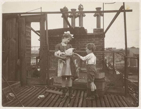 This photograph shows Waldemar Titzenthaler’s children, Marba and Eckart, with a rooster on the roof terrace of their Berlin home. The image offers a glimpse into the intimate, domestic world of a family living in Germany during a period of significant social and political change. The choice to photograph his children in such a setting, interacting with a farm animal, creates an interesting dialogue around ideas of childhood, nature, and urban life. During this time, there was a growing interest in the ‘back-to-nature’ movement as a response to increasing industrialization and urbanization. The photograph plays with the tensions between these contrasting worlds, posing questions about how urban families connected with nature. The photograph also gently touches on gender roles: Marba carefully cradles the rooster while Eckart feeds the animal from his hand. This moment reveals a delicate family dynamic while hinting at the broader societal expectations of boys and girls. Titzenthaler captures a fleeting moment of connection, inviting us to reflect on the complex relationships between family, identity, and the changing world around them.