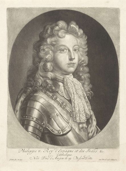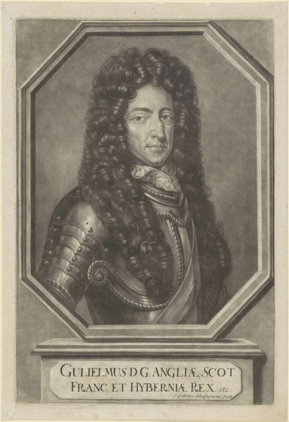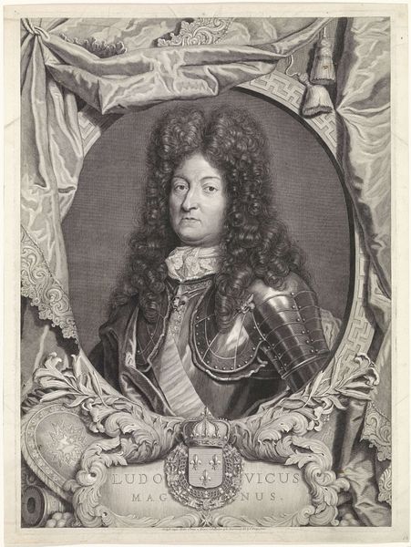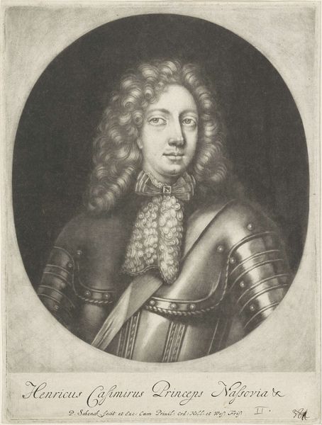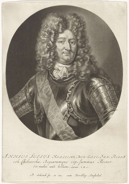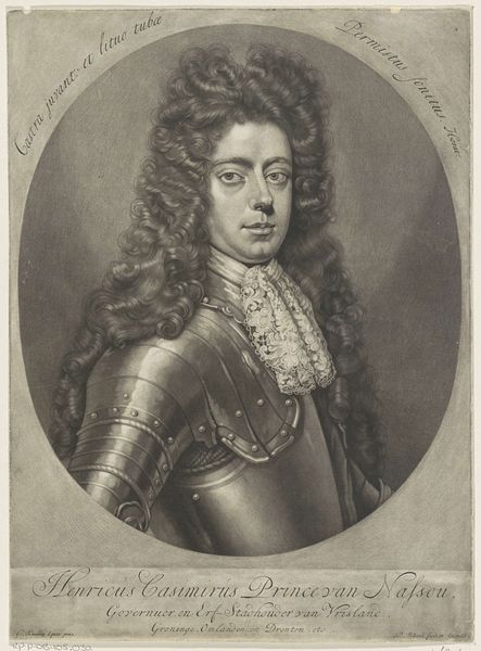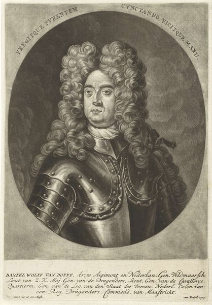 Curator: Here we have Pieter Schenk's "Portret van Lord John Cutts," an engraving dating from around 1670 to 1713, held here at the Rijksmuseum. Editor: The sheer volume of curls dominates this composition! It's as if the wig is the true subject, eclipsing the man and his armor beneath. Curator: Indeed! Consider that Lord John Cutts was a significant figure, a soldier and a governor. Schenk, through the reproducible medium of engraving, had a role to play in the manufacturing of his fame. How the materials were procured, and who was involved are all part of a broader history of image-making. Editor: Agreed, but Schenk's technical skill deserves equal consideration. Notice the meticulous detail in the armor, achieved solely through variations in line and tone. The balance of dark and light gives it such dramatic visual impact. Curator: The dramatic impact absolutely served to reinforce social standing. "Sweat and blood" declares the banner across the top. Think of the societal pressure during this time to support war efforts, and the labor required for Lord Cutts to achieve such status. Editor: I interpret that Latin phrase as being directly linked to Cutts’ personal intensity—not simply as propagandist sentiment. I look at his face, and then out to the smoky battlescape implied behind him. This is someone very present and very direct in expression and gaze. Curator: I would suggest his presence is one constructed and reproduced through skilled labor practices! Schenk, like others, served as a cultural cog. Editor: Regardless, Pieter Schenk creates a lasting testament here not only to a man and an era, but to the very power of visual representation. Curator: And hopefully one that encourages us to continue deconstructing the context that led to this construction.
