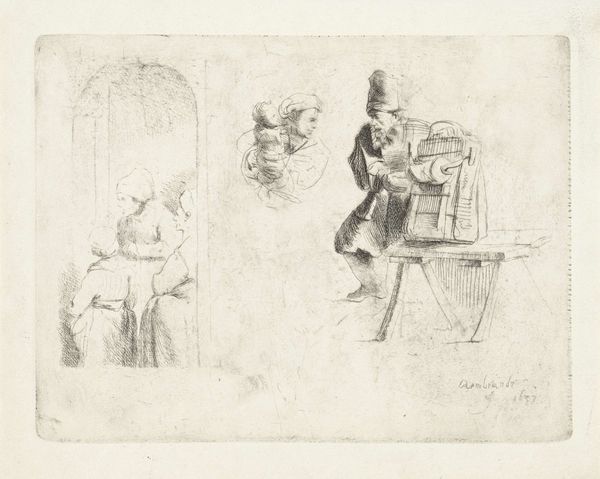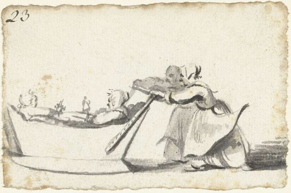 Nelly Bodenheim designed this silhouette illustration for the children's song "In Holland staat een huis." The artwork uses stark black silhouettes against a pale background, creating a visually arresting composition. The figures are arranged in a theatrical tableau; a man sits at a table, seemingly oblivious as a woman gestures dramatically towards a child and a distraught maid. Bodenheim uses the flatness of the silhouette to emphasize the gestures and the dynamics of the scene. The stark contrast between the figures and the background invites a semiotic interpretation, where each silhouette acts as a signifier of social roles, and the power dynamics within the household are palpable. The lack of color and detail forces us to focus on form and arrangement. Ultimately, this illustration, with its sharp lines and dramatic composition, serves as a powerful commentary on social hierarchy. Bodenheim’s formal choices amplify the narrative, making it both visually engaging and symbolically rich.