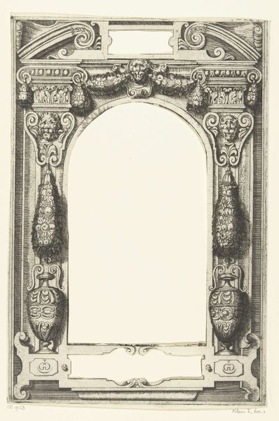 This is Albrecht Dürer's "Design for a Title Page with Ornamental Border and Coat of Arms of Willibald Pirckheimer," an intricate black ink drawing. The composition immediately presents us with a study in contrasts. The central rectangle offers a stark, empty space, compelling our gaze outward to the elaborate ornamental border, teeming with symbolic figures and motifs. Note the two cherubs at the bottom, holding Pirckheimer's coat of arms with its stylized tree. Above, the arrangement of classical columns, grotesque masks, and lush foliage creates a space dense with visual information. Dürer masterfully employs the semiotic language of the Renaissance, blending classical and humanist elements to honor Pirckheimer, a prominent humanist scholar. The stark white of the central void, framed by such detailed imagery, destabilizes any fixed interpretation, instead posing questions about the relationship between text and image, ornament and meaning. The drawing challenges us to consider how such visual structures contribute to the construction of knowledge and power.