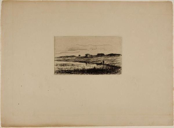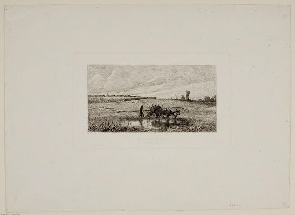 Curator: There’s a quiet intimacy to Charles François Daubigny's “Pasture at Villerville (Calvados).” It feels like a stolen moment. Editor: My first impression is the density of the mark-making—the sheer labor involved in creating that textured foreground and turbulent sky. Curator: It does have that tactile quality, doesn't it? Daubigny was truly masterful at capturing the ephemeral nature of light, air, the very pulse of the French countryside. Editor: It's interesting how Daubigny focuses on the working landscape here. There is a certain amount of labor involved in even the most pastoral settings, don't you think? Curator: Absolutely, the land is breathing, and Daubigny captures that in every etched line. It’s all about feeling the earth beneath your feet. Editor: It's a striking depiction of how labor and land are interconnected. Curator: I always feel transported when I see this piece. Editor: Yes, it's a reminder of the social structures at work, shaping the landscape.
