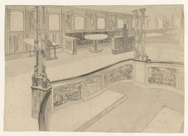 Curator: This watercolour by Jacob Ernst Marcus, from 1817, held here at the Rijksmuseum, depicts a grand salon. The walls are adorned with paintings, set off with ornate molding, all rendered in delicate colours. What catches your eye initially? Editor: It has an undeniably saccharine quality. The light pastels, the gilt details—it evokes an almost claustrophobic sense of aristocratic excess. It feels frozen in a pre-revolutionary dream, doesn't it? Curator: Interesting. For me, the repeated motifs are what resonate most. The small paintings inset into the wall, along with the dome above and repeated wall panel imagery, present classical themes framed within this opulent interior. The architecture itself seems to function as a frame for these curated images, a very intentional presentation of status and taste. Editor: Absolutely, but let’s not forget what’s implied through that presentation. The overt display, this performance of wealth, carries political weight. It reminds us who holds power, who controls the narrative, literally framing their version of history and beauty for generations to come. It speaks to the exclusion and inequality of the period. Curator: A fair point, it isn’t all sweetness and light, and the room might signal how art was used to convey not only beauty, but political power, for the elites of that era. But I can’t help noticing the care and artistry taken with the perspective. Notice how the vanishing point is just outside the window. It could point us to how the aristocracy saw itself—within a well defined, perfectly calibrated social order. Editor: I see that—but those artistic elements still reinforce existing structures of power, right? By showcasing the beauty and order available to the elite, the watercolor subtly affirms a hierarchy. Consider also the muted palette; is it an attempt to sanitise the potentially vulgar reality of such wealth? Curator: That's certainly one reading. Or could it be that the toned colours, the use of watercolours rather than oils, signifies a delicate, perhaps threatened beauty? What seems immutable could actually be fragile. Editor: I find myself returning to the space implied, where such 'fragile' beauty is maintained. Art provides clues of its use in maintaining societal order through both beauty and status. Curator: Yes, an image layered with meanings that invite deeper consideration. Editor: A dialogue we should continue.