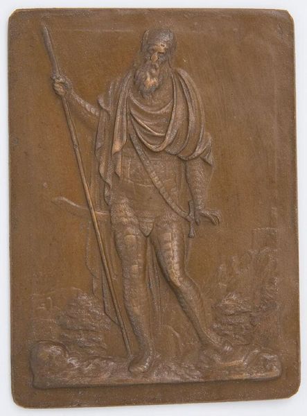 Editor: Here we see a bronze relief titled "Hope, from the series 'The Seven Virtues (standing)'" by an anonymous artist. The figure and the overall composition feel very classical to me. What can you tell me about its visual construction? Curator: Observe how the sculptor employs a low relief, barely emerging from the flat plane. The figure's drapery, while classical in inspiration, demonstrates a sophisticated understanding of line and form. How does the rendering of texture contribute to the overall effect? Editor: The texture seems to add depth, even though it's a shallow relief. It almost feels like a sketch brought to life in bronze. Curator: Precisely. The deliberate use of texture contrasts with the smooth, idealized form of the figure, creating a dynamic tension. This tension, combined with the figure's upward gaze, encapsulates the essence of hope. Editor: I see what you mean. Thanks for pointing out those details! Curator: My pleasure. Analyzing these formal elements allows us to better understand the artwork's expressive power.