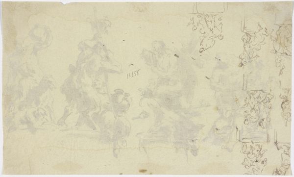 Curator: Juergen Ovens' "Landscape Sketch; reclining, cloaked figure; and pen tests," from the 17th century, drawn with ink on paper, is quite enigmatic. What do you make of its composition, particularly with those... abstract forms? Editor: Its subdued palette and loose linework immediately suggest a dreamlike or perhaps melancholic atmosphere. There's a haunting quality to the implied forms struggling to emerge. I also notice the apparent pen tests – what could they tell us about Ovens' working methods or the wider artistic practices of the period? Curator: Precisely! The existence of pen tests is integral to understanding this work—this isn't just a landscape. They demonstrate an iterative, experimental practice that sheds light on art production. These spontaneous marks contrast intriguingly with the intended imagery, don't you think? The material handling here signifies its cultural milieu. Editor: Indeed. Consider how studios functioned at that time. Drawings served various crucial roles—teaching tools, preliminary sketches for larger works, even independent art objects for discerning collectors. The cultural function of these drawings would give this picture another meaning! Curator: Note how the "reclining figure," although central, doesn't adhere to strict mimetic representation. Its structure is alluded to. That cloaked figure, nearly lost amongst the foliage. What is its intended meaning here? Editor: Given the period, allegorical interpretations arise. Is this figure representative of sadness or perhaps some form of mythological presence languishing amidst nature's grandeur? However, to pin this figure too firmly to a single historical meaning would, I think, flatten the work’s potential readings. Curator: I concur. While grounding the figure in, say, mourning traditions of the time offers context, restricting its potential symbolic value constrains our interaction with it. Ovens urges a deeper interpretation into shape and line itself. Editor: Seeing the texture and detail, I'm prompted to question how this Baroque era work interacts with institutions and wider socio-political factors. How have shifting political climates, such as patronage networks within royal courts, potentially steered the artwork and artistic circles towards their trajectory? Curator: Fascinating insights, considering both the materiality of the sketch and the complex historical threads that weave into its potential significance. We can see how seemingly humble pieces invite us into multilayered investigations of both formal and contextual elements.