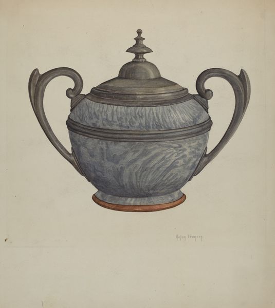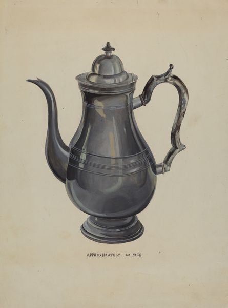 Editor: So, we have Dana Bartlett's "Pewter Teapot" from around 1937. It looks like a watercolor and coloured pencil drawing. It’s quite detailed, really showcasing the textures of the metal. What's your perspective on it? Curator: This piece highlights the labor involved in representing everyday objects. Consider the choice of pewter itself: relatively inexpensive and widely used, but requiring specific crafting techniques. How does the artist’s process – the choice of watercolor and coloured pencil – reflect or challenge the perceived value of the depicted object? Editor: That's an interesting way to look at it! I hadn’t considered the materials in relation to the status of the teapot itself. Do you think there's a statement about mass production in there somewhere? Curator: Possibly. Think about the accessibility of pewter objects in the 1930s, contrasted with the meticulous, handmade nature of a drawing. Is the artist perhaps commenting on the shift from handmade goods to mass-produced items? Consider also who was able to buy or make the tea itself, a rare and exotic product? Editor: That tension between the subject and the method is fascinating. It makes me think about the labor of both the craftsman creating the teapot, and the artist rendering it. Curator: Exactly. And what about the viewer, engaging with this representation? The act of looking, of appreciating the detail, also becomes a form of labor. This interplay between material, production, and consumption is central to understanding its value, wouldn't you agree? Editor: I do! I’m now looking at it as less of a simple still life and more as a commentary on class, labour and consumption. Thank you. Curator: It's amazing how focusing on the material aspects can completely transform our interpretation. I learned something from your perspective as well.
