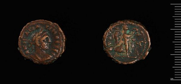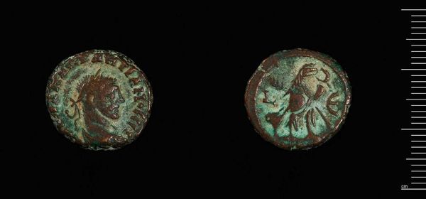 Editor: This is a Tetradrachm of Alexandria under Maximian from the Harvard Art Museums. The details are quite worn, but the profile and the bird are still discernible. What strikes you most about the composition of this piece? Curator: The die-cutting creates two distinct yet connected spheres of visual interest. The obverse, with the emperor's bust, is counterbalanced by the reverse, featuring the eagle. The patina, while obscuring detail, adds depth and textural complexity. Editor: So, the wear and tear are part of its aesthetic now? Curator: Precisely. The degradation introduces an element of chance, altering the original visual intent and creating a new dialogue between the object and its present viewer. Editor: I never considered that! It's fascinating how the coin’s physical form and composition create meaning. Curator: Indeed, by focusing on the artifact’s material presence, we gain unique insights into its enduring impact.