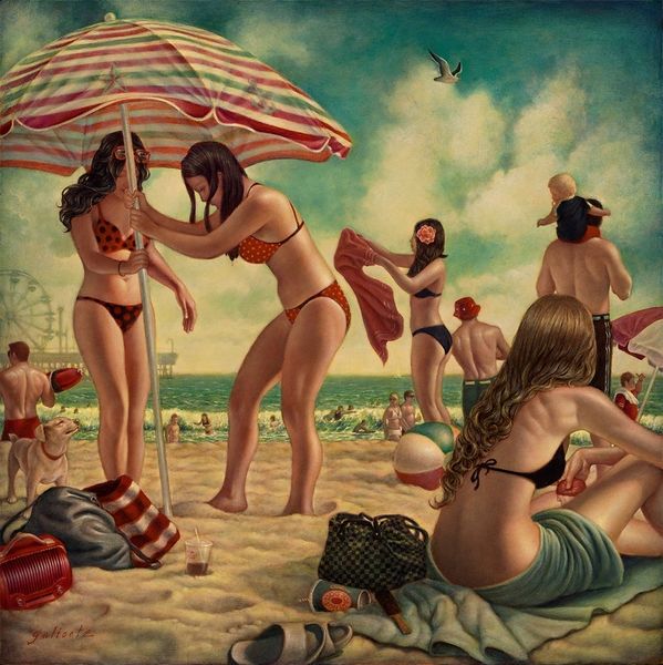 Danny Galieote painted Max's Day Out sometime in the 20th century using oil on canvas, a traditional fine art medium and support. The figures on the beach are rendered with remarkable realism, a direct result of the artist’s technique. Oil paint allows for layering and blending, critical for achieving the subtle gradations of light and shadow visible on the figures' skin. The scene is built up with carefully observed details, like the texture of the beach towel and the graininess of the sand. There is a consumerist touch, too, in the presence of mass-produced leisure items like the beach umbrella, ball, and sandals. The labor is less apparent here than in some other art forms. But the labor of leisure is represented. The people who are depicted are enjoying the fruits of their labor and the consumer products born out of industrialization. Understanding the artist’s skillful manipulation of his materials and the scene itself enriches our appreciation of this painting, highlighting how it transcends conventional boundaries of art and social life.