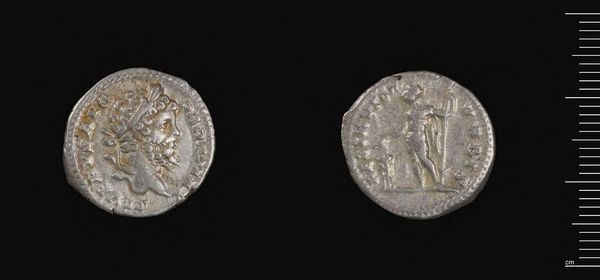 Editor: Here we have a Denarius of Severus Alexander. It's a small, silver coin and seeing both sides gives us different perspectives. What catches your eye? Curator: The effigy on the obverse arrests my attention. Note the crispness of the profile, the subtle variations in relief that define the facial features, and the laureate crown. These formal elements combine to create a powerful statement about imperial authority. Editor: So the coin isn't just about what it represents, but how the image is constructed. Curator: Precisely. Consider the reverse: the figure's posture, the drapery, the altar. The interplay of line and form invites deeper analysis of its symbolic language. Editor: I see what you mean! There is so much detail. Thanks for sharing your perspective. Curator: Indeed. This coin is much more than just a currency.