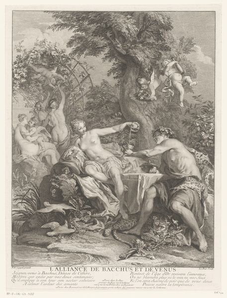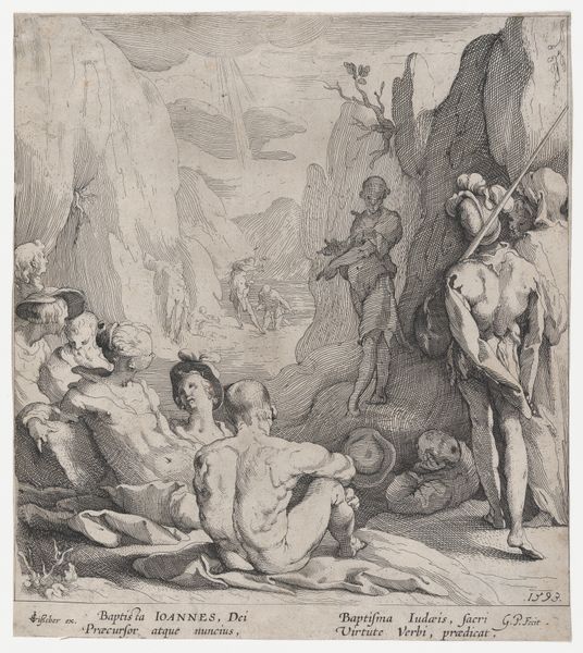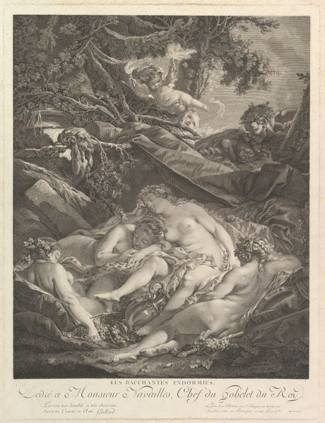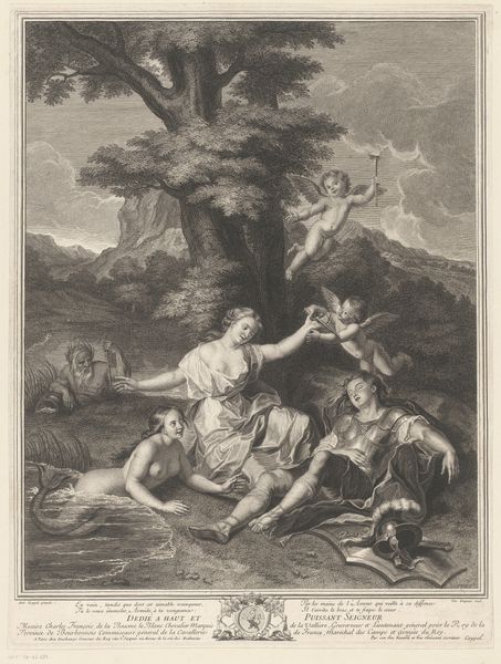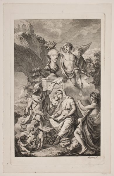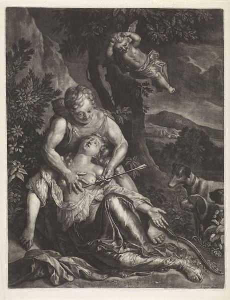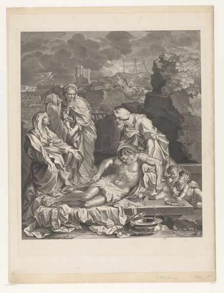Curator: This engraving, “Dying Magdalen Sustained by Angels,” was crafted by Claude Mellan around 1627. Its current home is the Metropolitan Museum of Art. What are your first thoughts? Editor: It feels like a chiaroscuro dream—or perhaps a beautiful etching on a tombstone, starkly narrating the very moment life flickers out, as a dark ground spawns ethereal, glowing figures. There's a raw vulnerability, almost like intruding upon something profoundly private. Curator: Observe how Mellan masterfully uses line to create dramatic contrast. The barren landscape and turbulent sky amplify Magdalen’s emotional distress. Her languid pose forms a dynamic diagonal, balanced by the attentive angels. Editor: Yes, the way she's draped, almost slipping away… It’s quite unsettling. And those angels – their wings don't seem grand and soaring but almost burdened, reflecting the gravity of the scene. There's a somber kind of tenderness there that almost melts the sharp lines. The engraver had a keen empathy, and you can feel it despite the scene’s inherent drama. Curator: Baroque art often strives for heightened drama through exaggerated gestures and symbolism, aiming to elicit an emotional response from the viewer, it seeks to involve, perhaps even overwhelm. Editor: Indeed, the whole scene feels poised between earthly suffering and divine grace. Makes you think about the transition, the delicate, wavering border. And as you mentioned, Mellan employs light in such a fascinating way… Like divine flashlight beams pinpointing emotion. The angel seems to be holding onto Magdalen, but where is she going, into shadow? Is the engraver celebrating or mourning? Is it hopeful, hopeless, or something entirely ambivalent? Curator: Indeed, it is the engraving's formal tension—the calculated balance between hope and despair. It elevates its narrative beyond a simple religious depiction into something more human, more ambiguous, making this encounter uniquely moving and affecting.