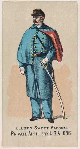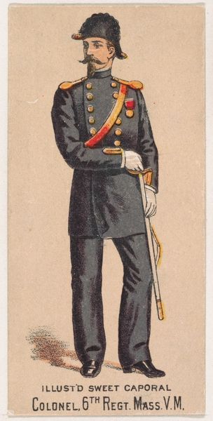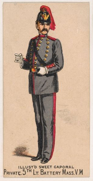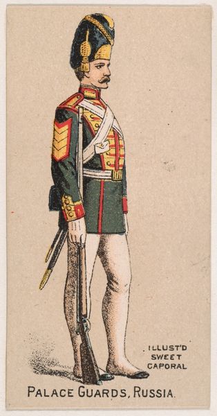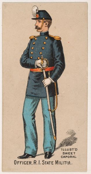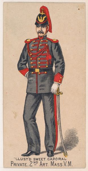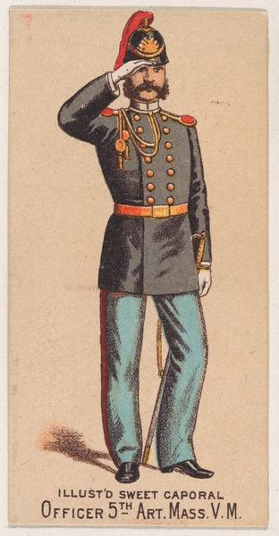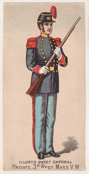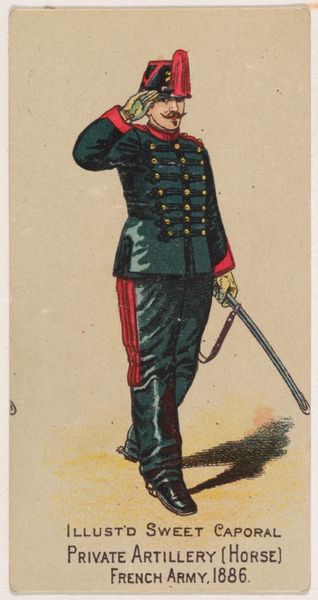 Editor: This is “Musician, New York State Militia,” a print from 1888 by Kinney Brothers Tobacco Company. It’s part of their Military Series, an advertisement for Sweet Caporal Cigarettes. The image depicts a musician with a bright golden horn. There's something comical about the seriousness of the musician's posture combined with the promotional aspect, a weird kind of satire, almost? What stands out to you when you look at it? Curator: Satire... I love where your head is going! It feels like a sideways glance at the militaristic pride of the era, doesn't it? And the colors practically shout "Look at me!" – it’s pure visual theatre, designed to grab your attention in a crowded shop. But think about the context. Cigarette cards were like little windows into the world. What kind of world do you think they were trying to sell alongside those Sweet Caporals? Was it really about patriotism? Or about the alluring appeal of a life less ordinary? Editor: I hadn't thought about the "world" they were selling… probably both, packaged together. It's interesting how a little rectangle of printed paper can reveal so much! Curator: Exactly! This card reminds me that art doesn't exist in a vacuum. It whispers stories about who we were, and sometimes, who we still are. A jaunty tune masking something far more complicated. Editor: Thanks! Now I’ll look at advertisements in a very different light. Curator: My pleasure! I love the way it's still sparking conversations and questions all these years later. The most wonderful artworks keep you looking, pondering, maybe even humming a little tune… hopefully something other than a military march, of course.