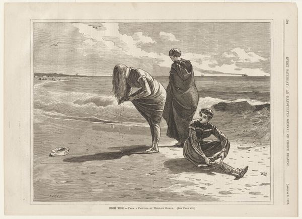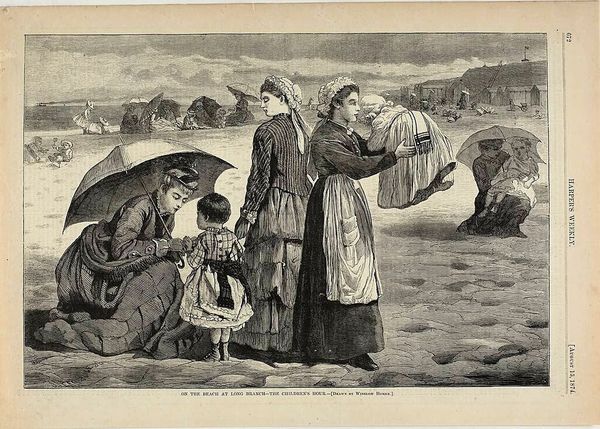 Editor: This is "Dad's coming!" designed by Winslow Homer. I’m really drawn to the textures. The woodcut gives such a distinct feel to the scene, especially the boats. What can you tell me about the materiality of this piece? Curator: Well, consider the original context: Harper’s Weekly. Wood engraving allowed mass reproduction and dissemination of images. Labor was divided; Homer designed it, others engraved it. So, what is "original" here? It’s a manufactured image meant for mass consumption. Editor: So, it's less about Homer’s hand and more about the system of production? Curator: Precisely. The value isn't in singular artistic genius, but the network that creates and distributes the image. Editor: That really shifts my understanding of its worth. Thank you!