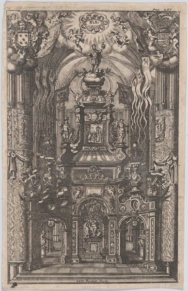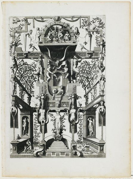 Wendel Dietterlin created this etching of the upper portion of an altarpiece with the Coronation of the Virgin, sometime in the late 16th century. The image is dominated by a complex, symmetrical structure, teeming with figures and ornamentation. Dietterlin’s precise linework creates a dense, almost claustrophobic space, reflecting the ornate style of the period. The composition is rigidly hierarchical, with the coronation scene at the very top, and the figures below arranged in tiers. The interplay of vertical and horizontal lines, coupled with the intricate details, gives the work a sense of both grandeur and complexity. Dietterlin’s approach here reflects a broader artistic concern with elaborate, architectonic forms. Through its careful arrangement of form and line, the etching evokes the religious and cultural values of its time. The altarpiece becomes a visual representation of a structured cosmos, with divine order reflected in its architectural design. This structured image invites us to consider how such displays of power and order are constructed through art.