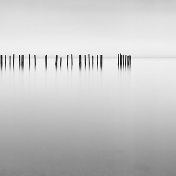 Richard Misrach captured "Salton Sea (with TV Antennae), California" with his camera, presenting a landscape dominated by horizontal bands of muted colors. The image is divided into thirds, where the upper band of pale sky meets a middle band of light-reflecting water, the lower band of soft gradient transitions into a darker, more reflective plane. The vertical wooden posts rhythmically punctuate the watery expanse, creating a stark contrast against the serene backdrop. The placement of these structures, along with the skeletal remains of a building to the left, disrupts any sense of natural harmony, suggesting a human impact on the environment. This juxtaposition invites a semiotic reading of the landscape as a signifier of ecological disruption. Misrach uses the formal elements of line and composition to explore the themes of environmental degradation and the uneasy relationship between humanity and nature, challenging us to consider the unseen structures that govern our perception and interaction with the world.