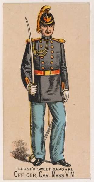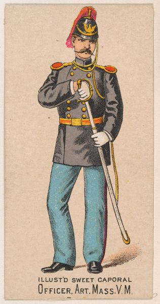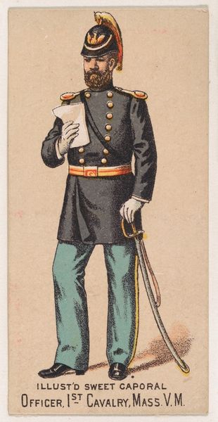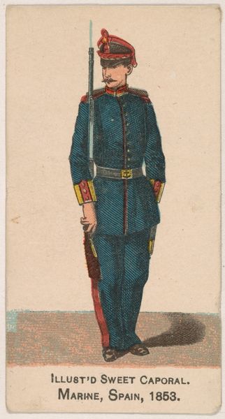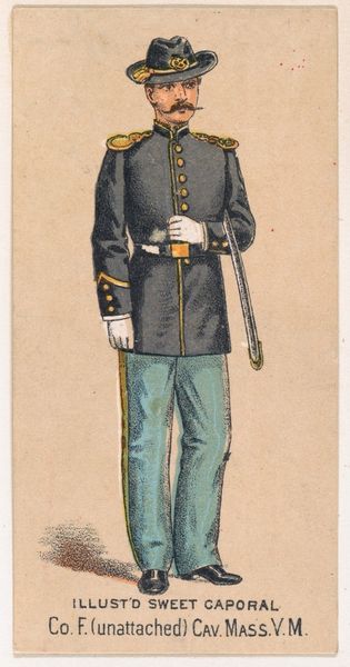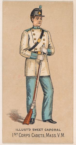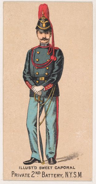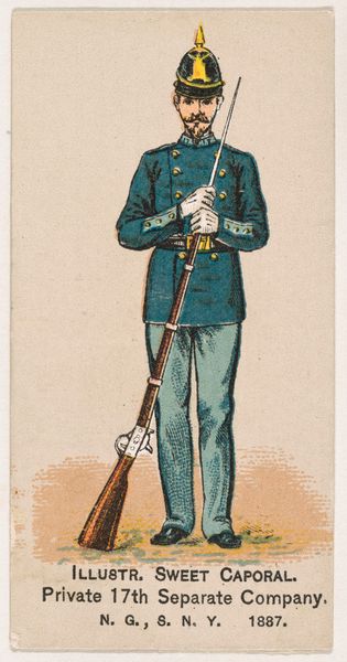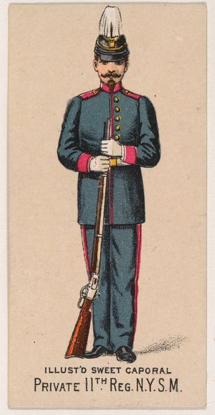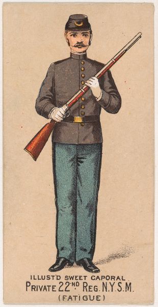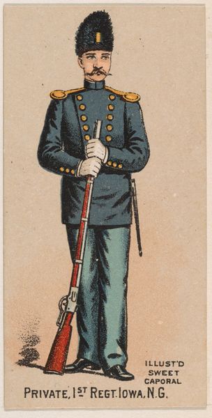 This chromolithograph of a New York State Militia private was produced around 1888, as part of a series of collectible cards for Sweet Caporal Cigarettes. These cards were ubiquitous, reflecting a culture deeply intertwined with both tobacco use and military ideals. The image presents a vision of uniformed authority—but it is also an advertisement, subtly normalizing militarism for everyday consumers. Consider the era: Reconstruction was faltering, and the myth of the "Lost Cause" romanticized the Confederacy. These cards often glossed over the complex racial and ethical dimensions of military service, promoting instead a sanitized image of national unity. What does it mean to see a soldier as a marketing tool? How might this have shaped perceptions of duty, honor, and conflict? This seemingly innocuous card invites us to reflect on the narratives we consume, and the ways they shape our understanding of history and identity.