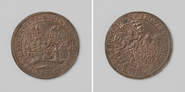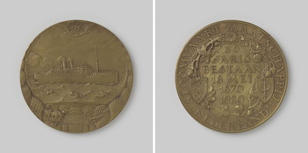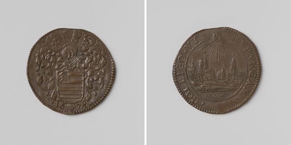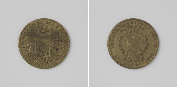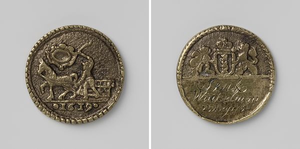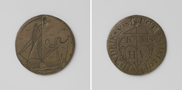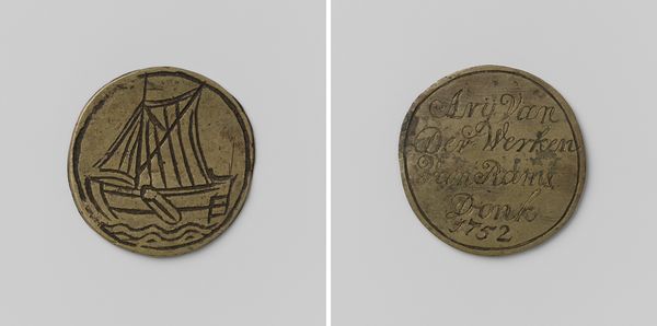 Curator: So, we're looking at a rather curious object: a guild token from 1648, representing the Roei-, Steiger-, en Schuitenvoerdersgilde—the Amsterdam guild of rowers, dockworkers, and barge haulers. It was created by Verret de Boer and commemorates their mooring place at Harlinger steiger. It's a relief, a print, rendered on metal—perhaps silver. Editor: Immediately, the crude style of the engravings strikes me, endearingly amateurish, in a way! A perfect boat rendered with about seven lines and what looks like a dog… It’s weirdly charming! It almost looks like it could be on pirate booty, something I would have discovered buried in my yard. Curator: The imagery certainly speaks volumes. We have, on one side, the sailing vessel, naturally symbolizing their maritime occupation, and the date is engraved on either side of it within the border wreath. On the flip side, there is the figure of a working man surrounded by items representing daily life along with letters and glyphs which are a statement of the guild’s presence and activity in that place. All the symbols reflect cultural values that endure, work, perseverance and, prosperity. Editor: It is interesting how they immortalized everyday labor! To think that ordinary people had the need or perhaps desire, for representation on something approaching coinage, that could endure the elements is mind-blowing, you see how history itself is constructed around those memories. The imagery around the central figure on the coin is particularly revealing, I love those water jugs that surround the figure! It gives one a sense of hard physical labor rewarded with cold, nourishing, replenishment. Curator: These objects, while seemingly humble, provide such a tangible link to the past. The level of care indicates not a commercial goal but one related to pride, unity, and community, offering profound insights into the social fabric of 17th-century Amsterdam. Editor: I think this coin speaks volumes about how ordinary people made sense of the world, and how those people desired the exact same form of remembrance we do! After reflecting, the artist here truly encapsulated the common memory that the laborers possessed and turned it into iconography, a memento to themselves and now a view to the present.