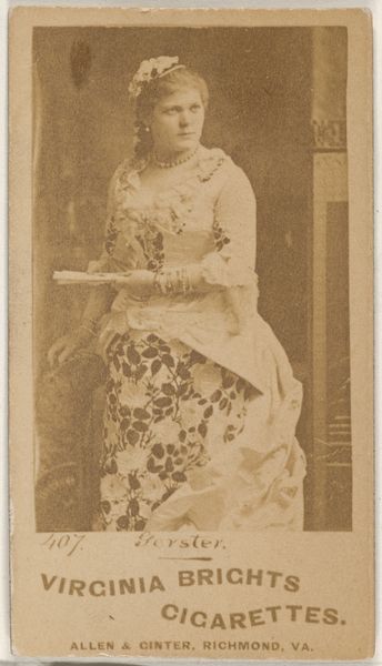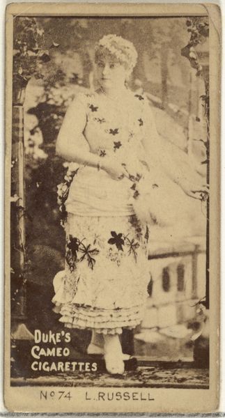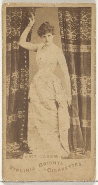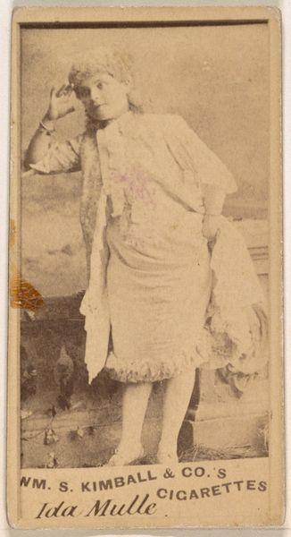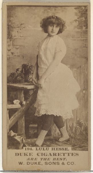 Editor: This is "Floy Crowell, from the Actors and Actresses series," made between 1885 and 1891 by Allen & Ginter. It combines drawing, photography, and printmaking. I'm struck by the way she's framed by that rustic wooden fence and how the overall effect creates a sense of theatricality. What are your thoughts on this portrait? Curator: It's fascinating to consider these cards within the context of celebrity culture at the time. Actresses like Floy Crowell gained visibility through these mass-produced images, blurring the lines between art, commerce, and representation. What does it mean to commodify female performers in this way, offering their likenesses as a "perk" to sell tobacco? It prompts us to examine how gender, labor, and visual culture intersected in the late 19th century. Does her gaze, her gesture, read as empowering or exploitative to you? Editor: I see your point. There's a tension between presenting her as a desirable object and recognizing her profession. It makes me think about the limited opportunities for women in that era, and whether this kind of fame could have provided a path toward some kind of independence. Curator: Precisely. And what of the implicit narrative being constructed around "Virginia Brights Cigarettes" by association with her glamour? There’s the unspoken association with the New Woman, smoking as an assertion of newfound freedoms. It encourages viewers to think about her race too—was whiteness implicitly valued by advertisers at this time? This seemingly simple portrait unlocks broader dialogues about social change, identity and power. Editor: That's so insightful. I hadn't considered those layers. It's a powerful reminder of how seemingly simple images can reflect and reinforce larger social dynamics. Curator: Absolutely. The artwork isn’t merely a representation, it is evidence. Paying close attention can help us to consider social power dynamics that affect and connect us all.