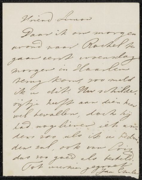 This letter was written by Nicolaas Pieneman in the mid-19th century, during a period of significant social change and growing national consciousness in the Netherlands. The letter, addressed to an anonymous recipient, offers a glimpse into the personal and professional life of an artist navigating the social structures of his time. Pieneman discusses arranging a sitting for a portrait, a commission that reflects his status as a sought-after painter within the Dutch elite. The formal tone and careful handwriting reveal the importance of social etiquette and professional decorum in his world. Consider how Pieneman's identity as a male artist from a privileged background afforded him certain opportunities, while simultaneously shaping his artistic vision and the subjects he chose to portray. Letters like these serve as poignant reminders of the intricate connections between art, identity, and the historical forces that shape our understanding of the world.