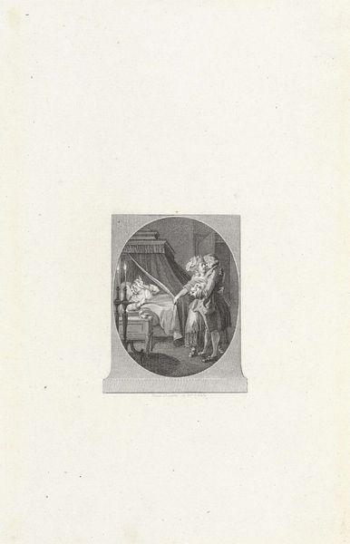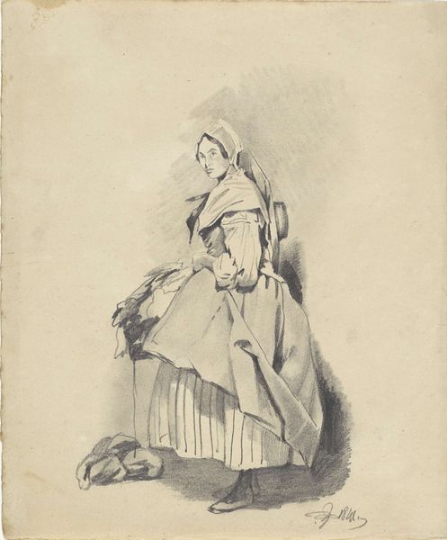 Editor: Here we have Reinier Vinkeles' "Woman with a Helmet by a Half Column," created around 1800. It’s a print, a pencil and engraving piece. I'm immediately struck by the woman's confident posture, but the classical imagery feels a bit… removed, distant. How do you interpret this work? Curator: This piece invites us to consider the loaded visual language of Neoclassicism. We see a woman, allegorically adorned with a helmet, juxtaposed against the rigid structure of a classical column. Consider the period, around 1800; what do you think such symbolism was communicating, especially concerning ideas about female virtue or citizenship after the French Revolution? Editor: I see what you mean. The helmet and column suggest strength and tradition, but it’s also very controlled. It feels like a specific idea of womanhood being presented. Is it maybe about defining women's roles in the wake of revolution? Curator: Exactly. And let's think critically about that column – it’s only half there. What might that fragmentation represent? Perhaps a break with the past, but also an incomplete vision of the future. The woman gestures outward, towards something beyond the image itself. Could she be pointing towards an active role, even within a restrained symbolic framework? What do you think this image says about the constraints of the period on people living through revolutionary times? Editor: That's a really interesting point about the fragmented column and the active gesture. I hadn't considered how the composition itself speaks to the tension between revolution and restriction. This makes me think about the ways societal expectations of women persist and evolve even in moments of great change. Curator: Precisely. By examining the visual codes within the piece and thinking about the historical context, we can explore the complex relationship between artistic expression and social commentary, allowing for a greater understanding of women during revolutionary times. Editor: I definitely see it differently now. It's less a distant image and more a snapshot of a complex social moment.