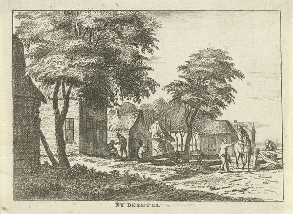 Curator: Let's take a look at "View of a River" by Hendrik Roosing, created in 1780. It's a beautifully detailed engraving, part of the Rijksmuseum collection. Editor: It has a lovely pastoral quality. I'm immediately struck by the balance – a sort of asymmetrical symmetry created by the detailed trees on the right and the boat on the left. A slice of daily life made permanent in the age of Enlightenment. Curator: Precisely. The engraving technique allows for exquisite details. Roosing is depicting a very specific time and place, isn't he? Observe the positioning of the figures and the implied social hierarchy. People in carts are separated by proximity from the working man walking the road. Editor: And notice the interplay of light and shadow. See how he uses fine lines to suggest the shimmer on the water and the rough texture of the thatched roofs? I find that compelling from a purely formal perspective – how he builds the entire image with these delicate strokes. What do you think that might mean for a viewer in the late eighteenth century? Curator: I'd suggest it romanticizes labor, fitting a demand of idyllic representation, almost masking the harsh realities of rural life for both wealthy patrons and a burgeoning middle class wanting to connect to simpler ways. The inclusion of the title “Te Berkel” indicates that this slice of life isn't some fantasyland, but rather a real village where real people navigate real structures of society. Editor: A perfect summary, really. You know, seeing the river depicted as this central artery reminds me how essential such waterways were for trade and transportation. That small community in the etching probably thrives precisely because of its geographic access to broader routes. The tiny windmills there in the background make an important contribution to trade. Curator: It speaks to how artistic interpretation can offer a multifaceted view. We see the aesthetic choices, the artistic skills involved, but also the historical context informing not just the artwork’s creation but also its subsequent viewing. Editor: A fitting end, I think, bringing both the structural and societal elements of art to light for us. Thanks for your time.