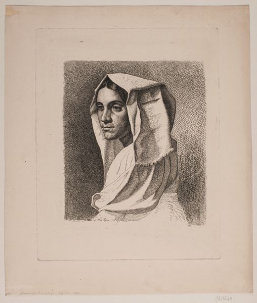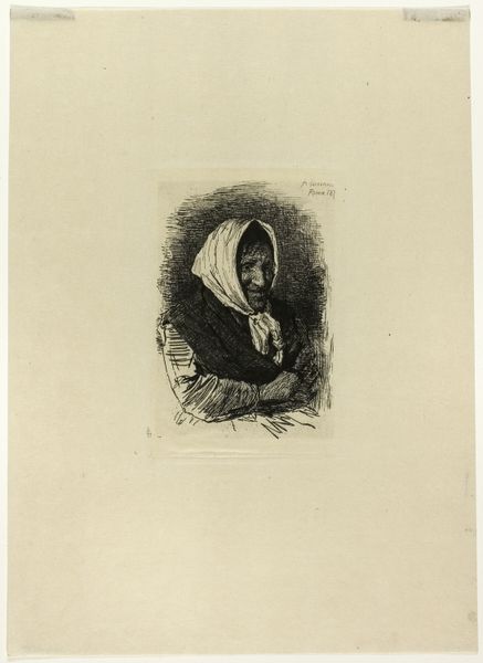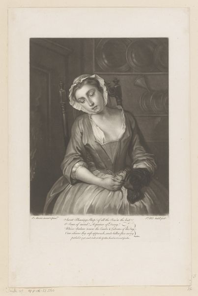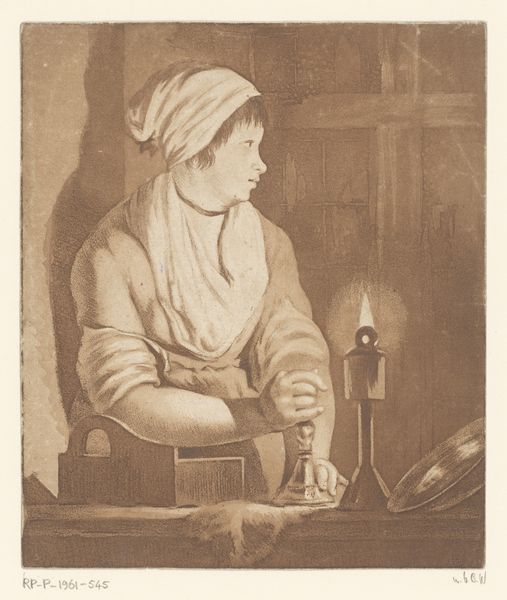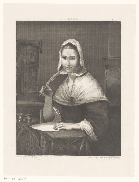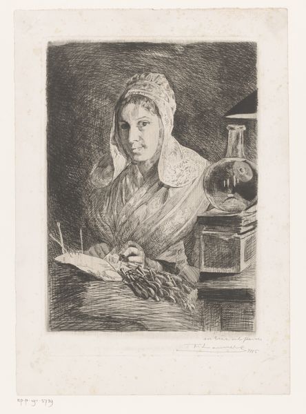 Editor: So, here we have Frans Lauwers’ "Kantklossende vrouw," or "Woman Making Lace," from 1885. It’s an etching, and I’m really drawn to how simple it is. The woman’s face is so serene. I am curious what others make of it – what do you see in this piece? Curator: For me, this isn't just a genre painting; it's a whispered secret about the dignity of labor. The quiet industry of the woman, caught in this intimate act of creation... It feels almost like catching a glimpse into another world. The realism reminds me of Dutch Masters, wouldn't you agree? It feels honest and unadorned. There's no grandiose narrative here, just life. Look at her concentration! Isn’t there an almost sacred feeling there? Editor: Definitely! That intense focus is mesmerizing. And the bottle behind her almost looks like a scientific instrument, like she’s experimenting rather than just working. What do you make of the bottle and books as objects? Curator: Well, now, aren’t those beautiful interruptions to our viewing? What I call a visual encore! The bottle could hint at a pursuit of knowledge or alchemic dedication to her craft. It's subtle, but potent, don't you think? All the surrounding objects build her intimate, industrious world that isn't too far off from how the Dutch masters built such worlds as well. Editor: I didn't consider alchemy! I’ve come away looking at what a woman creates but the focus I should give is where, in the world, that creation happens. Thanks, that gives me a new way of considering the whole work! Curator: Precisely! Art is all about learning different ways to see! And that is, after all, what makes it so rewarding to create, isn't it?