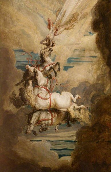 Curator: Here we have "The Triumph of the Duke of Wellington (sketch)," by James Ward. Though the date is unknown, its dramatic flair places it firmly within the Romantic period. Editor: Wow, a whirlwind of horses, angels, and...demons? It feels less like a triumph and more like the apocalypse has been upgraded with a high-society carriage. Curator: Exactly! The sketch utilizes a historical lens through the Duke of Wellington. You’ve got allegorical figures swirling around him – Justice, Britannia. It aims to depict not just victory, but its cosmic significance. Ward is situating Wellington's triumphs within a much grander narrative, as something providential and inevitable. Editor: The sheer scale of everything, the drama… it’s so over the top! And is that a snake wrapped around a classical column? This piece really captures a specific moment in British history, and turns it into an operatic spectacle! How interesting, also, is the role of the white horse! Curator: This piece reflects the public’s perception of Wellington and war through popular imagery and commemorative objects in the period. There was certainly political weight in portraying Wellington as almost divinely guided. This would have solidified narratives of British superiority, casting his victories as necessary and righteous on a cosmic scale. Editor: Thinking about Wellington sitting pretty in his chariot, the real people, you know, in the war? It’s jarring. But there is power in a piece so unafraid to be big and ridiculous. I still cannot unsee the angel in all of this! It brings to mind, even in the history, that the best art should evoke feeling. Curator: That is exactly where the painting succeeds – making visible and emotionally real for the public complex power dynamics. The triumph becomes a shared belief. Editor: Leaving me to think maybe triumph isn't just a fact, it's a story we tell ourselves.