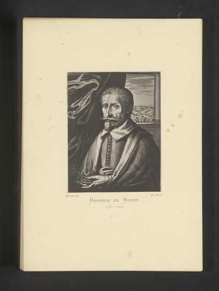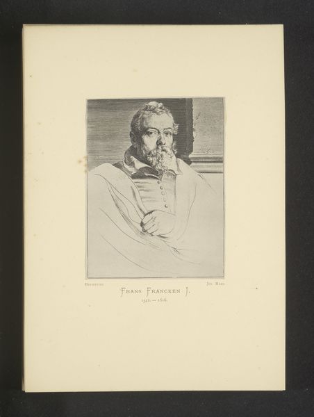 Editor: This is a reproduction of a portrait of Frans Francken II, engraved by Willem Hondius. It’s likely from before 1877, so quite some time after Francken’s life. It's a very formal portrait; what catches your eye? Curator: The ruff. That elaborate collar speaks volumes, doesn't it? It immediately positions Francken within a certain social sphere, hinting at status and wealth. Think about what the ruff conceals and reveals. Editor: Reveals? I just see it as restrictive, hiding the neck. Curator: Precisely! It restricts movement, dictating posture, communicating control. But think also about the expense and labor required to maintain that crisp white. What does whiteness represent in many cultures? Purity? Status? Editor: I guess it signals affluence and a certain adherence to societal norms. But it's a copy, so does that dilute the symbols? Curator: Not necessarily. Reproduction democratizes access to imagery, but also subtly alters its message. Consider, why reproduce Francken? What aspects of his identity were being highlighted or re-interpreted by making it into a print? His serious countenance seems meant to communicate intellect. Editor: I hadn’t considered the choice of *which* image to reproduce, only the act of reproduction itself. So it becomes a statement about the person *and* the values being assigned to them later. Curator: Exactly. It is a layered conversation. Each element echoes or reinterprets another element, forming a chain of cultural memory. Editor: That's a very interesting approach! I'll definitely keep that in mind when looking at similar pieces.