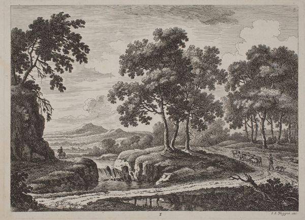 This print, made by Alexandre Calame, presents us with a scene dominated by trees and a prominent rock. In art, trees often symbolize life, growth, and connection to nature, while rocks can represent stability, endurance, or obstacles. The image of trees clustered around a rock echoes through time. In ancient myths, sacred groves were places of wisdom and refuge, not unlike the sense of shelter these trees provide. Consider the motif of the "axis mundi" – the world axis – where a tree or mountain connects the earthly and divine realms, symbolizing a pathway to spiritual understanding. Note the feeling of solitary contemplation evoked by the composition. This emotional depth resonates on a subconscious level, tapping into our collective memory of nature as a source of solace. The image, while seemingly simple, invites us to reflect on our place in the world. The trees, the rock, they recur and evolve, prompting new interpretations.