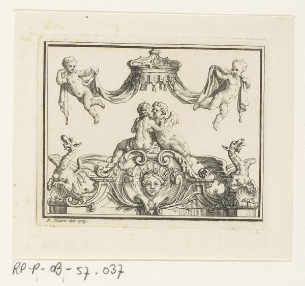 Benedikt Winkler created this engraving, “Putti dragen een grafsteen,” at an unknown date, presenting us with potent symbols of mourning and memory. At the heart of this image are the putti, cherubic figures derived from classical art, who carry not just a gravestone, but the weight of remembrance itself. Note how these figures, often associated with love and innocence, are here burdened with solemn duty. Consider, too, the laurel wreath—an ancient symbol of honor and victory—now repurposed to frame a memorial. This juxtaposition speaks volumes about how societies grapple with loss, transforming symbols of triumph into emblems of grief. The motif of putti appears throughout art history, from ancient Roman sarcophagi to Renaissance paintings. Yet, their presence here, supporting a gravestone, is particularly poignant. It reflects a cultural desire to soften the harsh reality of death, imbuing it with a sense of gentle cherubic transition. The emotional power lies in the recognition of mortality, yet softened by the innocent beauty of the putti. It's a reminder of how deeply embedded these archetypes are in our collective consciousness, continuously evolving to express the complexities of the human experience.