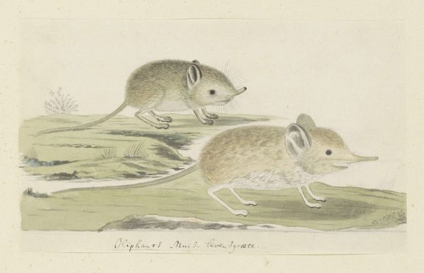 Curator: At first glance, they seem like furry potatoes with tiny hands. Editor: Look closer. What you're seeing is Robert Jacob Gordon’s rendering, circa 1777-1779, titled "Chrysochloris asiatica (Cape golden mole)." It is made of watercolour and pencil on paper. Curator: The poses are just fascinating. The golden mole centered seems to be confidently displaying its profile while the other two strike more timid or even defensive poses. Is this Gordon representing hierarchy? Editor: Perhaps. Gordon was a complex figure, a military man in the service of the Dutch East India Company, who, nonetheless, showed great interest in the indigenous peoples and natural life of the Cape. One could read this image through the lens of colonial taxonomy and power. Who gets to see, who gets to name, and to what end? The act of rendering, of scientifically documenting a creature, certainly had political implications. Curator: Absolutely. And in light of the animal's name, how does this golden shimmer complicate our perception of wealth, land, and who profits off both? Are these 'portraits' commenting on ecological concerns, early industrial capitalism, even imperialism? Editor: The colour is undeniably striking. Even captured with humble watercolour and pencil, the implied iridescence feels special. One could examine this creature as a potent symbol of hidden wealth, reflecting cultural attitudes towards both the natural world and its resources. Its small size emphasizes a sense of preciousness. Curator: Do you think it's reaching too far to suggest the poses hint at social performances enacted because of interactions with colonizers? Maybe some are braver for the encounter while others have succumbed to submissive roles, thus creating commentary on imposed social roles and expectations during that period? Editor: I think it's fair to suggest Gordon's illustrations invite conversations on colonialism’s impact and lasting impression on nature and identity. The illustration acts as a portal into a nuanced exploration. Curator: Ultimately, it is up to us now to recognize, challenge, and reconcile history with sensitivity, empathy, and an ever present critical lens. Editor: I agree, considering what these symbols truly mean allows a deeper more personal connection to this period piece. Thank you for that context.