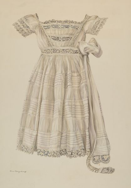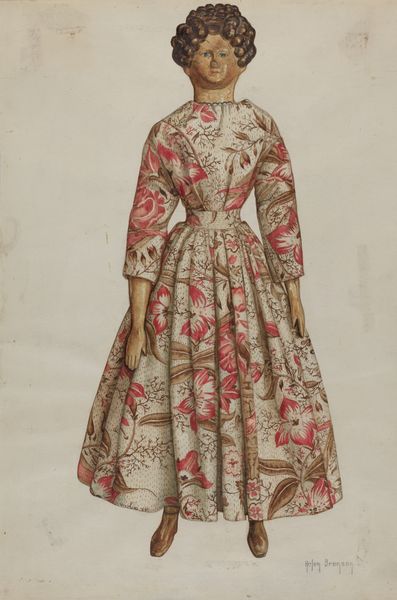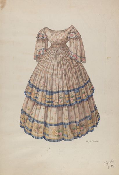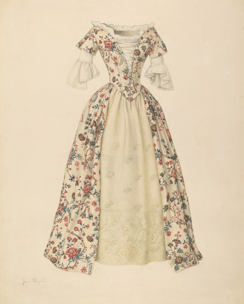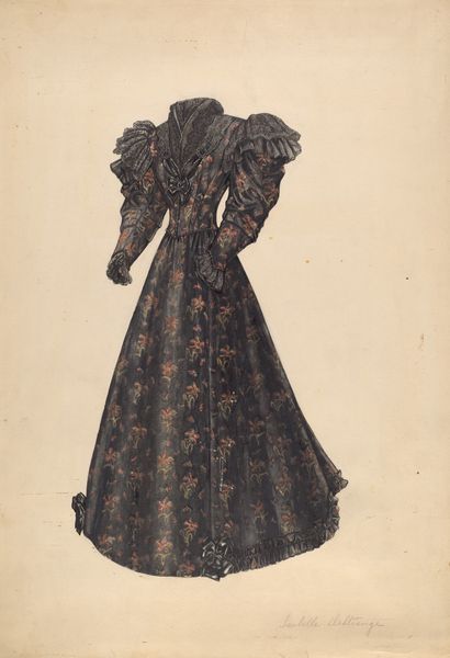 Marie Famularo made this rendering of a girl's chintz dress in 1938. The design is carefully painted with watercolor on paper, likely intended as a reference for garment production. The choice of chintz, a glazed cotton fabric known for its vibrant, printed patterns, suggests a connection to both global trade and domestic life. Originating in India, chintz became popular in Europe and America through the East India Company, embodying a complex history of commerce, colonialism, and consumption. The dress itself reflects the social context of its time, with its modest design and emphasis on practicality, yet the puffed sleeves lend a touch of femininity and charm. Famularo's attention to detail, from the delicate floral motifs to the subtle variations in color, speaks to the value placed on craftsmanship and skill in the textile industry. By focusing on the material and the labor involved in its creation, we can appreciate this artwork not only for its aesthetic qualities but also for its insights into the cultural and economic forces that shape our everyday lives.