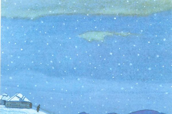 Editor: Here we have Nicholas Roerich’s "The Treasure Diviner" from 1943, created with tempera. The stark, almost mystical landscape really captivates me, particularly how the tiny figures in red seem to huddle together in reverence. What strikes you most about this piece? Curator: What's fascinating is Roerich's persistent engagement with cultural anxieties through his art. "The Treasure Diviner" reflects the anxieties of wartime through a landscape that offers the *promise* of abundance - spiritual or otherwise - even as figures are portrayed searching. Roerich was deeply involved in the spiritual movements of his time and often portrayed esoteric themes, so the real "treasure" might not be material. Why do you think Roerich placed those red figures so prominently in the composition? Editor: I suppose it could be about emphasizing the human element, making it clear that this quest for treasure is something deeply personal, but also maybe collective? Curator: Precisely! Think about the wartime context. People sought hope, meaning, something beyond the devastation around them. Roerich presents this almost allegorically – the landscape as a source, perhaps delusive, of that very hope. How does the vibrant blue and red colour palette play into that dynamic? Editor: It’s quite a contrast actually. The blues feel serene, while those vibrant reds grab your attention and almost feel a bit…desperate? Like a stark contrast between serenity and turmoil. Curator: Exactly! The artist used symbolism to discuss the sociopolitical reality of WWII and position it through vibrant colour and stark landscape imagery, where Roerich explored and commented on cultural, and human anxieties. Thank you for sharing your thoughts. Editor: I didn't realize how much social commentary was packed into this painting! Thanks for shedding light on it.
