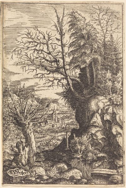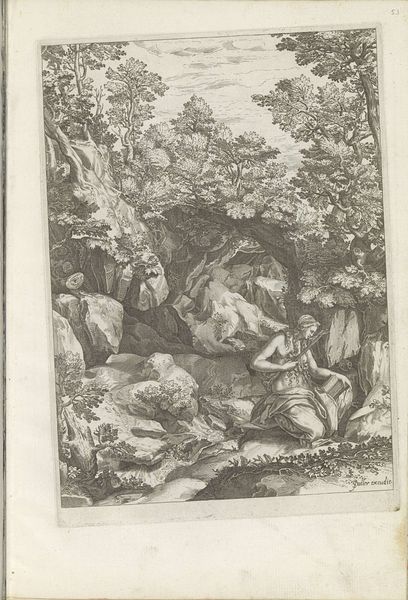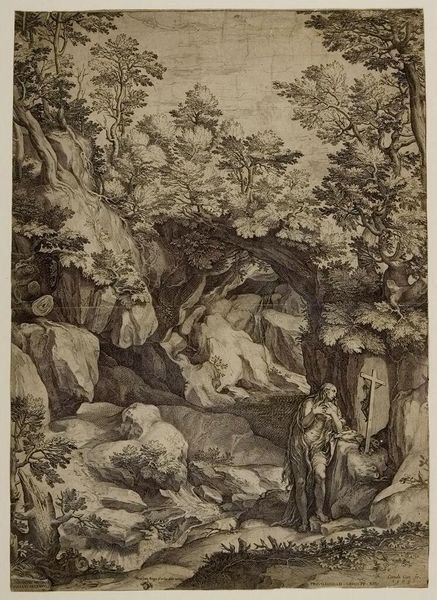 Editor: So, here we have "Mary Magdalen Repentant in the Wilderness," a print from 1573 by Cornelis Cort, currently residing at the Met. The detail is incredible for a print; it almost looks like a charcoal drawing. The cross, figure, and trees stand out sharply. How do you interpret the compositional choices in guiding the viewer's eye? Curator: Observe the interplay of light and shadow across the picture plane. Cort's expert rendering models spatial depth within this rather flat medium, giving solidity to form and varied textures throughout. Consider the organization of elements: Magdalen and the cross are firmly located within the bottom right, acting as the corner to contain the whole pictorial architecture. Do you find that organization of forms directs our viewing experience? Editor: Definitely. It’s interesting how the diagonal lines of the landscape all seem to converge near Mary Magdalen, yet her downward gaze seems to contradict that, keeping the viewer locked within that lower quadrant. Curator: Precisely. Notice how Cort has paid careful attention to minute shifts in tone that gives volume and shape across this natural, unadulterated setting, all in a medium predicated on linear exactitude. Furthermore, how does Cort construct the overall composition as a unified and internally referential form? Editor: The density and direction of the engraved lines clearly delineate the physical contours. It feels less about illusionism and more about emphasizing the artifice of the image itself. Curator: Indeed, and consider how this linear abstraction contributes to a certain emotional distance. While the subject matter might suggest raw emotion, Cort’s formal approach invites us to appreciate the artistic labor inherent to the work. A keen contrast to subject, and a compelling tension achieved through medium. Editor: This close reading gives me a whole new appreciation for the formal mastery at play! I can certainly better see the structural nuances you are pointing out here. Curator: Recognizing the aesthetic value embedded in artistic problem-solving will enrich your experience of art for years to come.